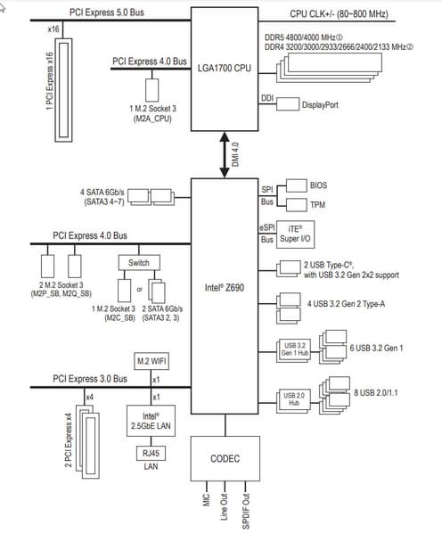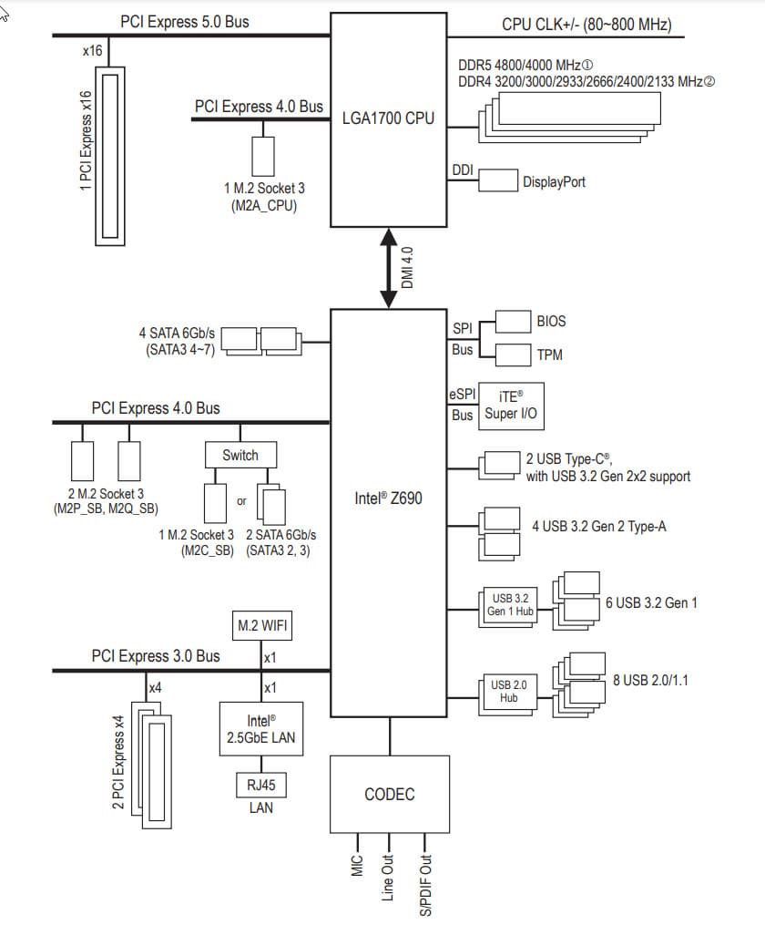 Процессоры Intel Core 12-го поколения (совместимые с сокетом LGA1700 и поддерживаемые Z690) имеют 20 линий ввода-вывода (16 PCIe 5.0, 4 PCIe 4.0), не имеют USB и SATA портов. При этом взаимодействие с Z690 идет по особому каналу Digital Media Interface 4.0 (DMI 4.0 x8). Все PCIe линии процессора идут на слоты расширения PCIe и порт М.2. Serial Peripheral Interface (SPI) используется для взаимодействия с системой UEFI/BIOS, а шина Low Pin Count (LPC) — для связи с устройствами ввода/вывода, не требующими высокой пропускной способности (контроллерами вентиляторов, TPM, старой периферии).