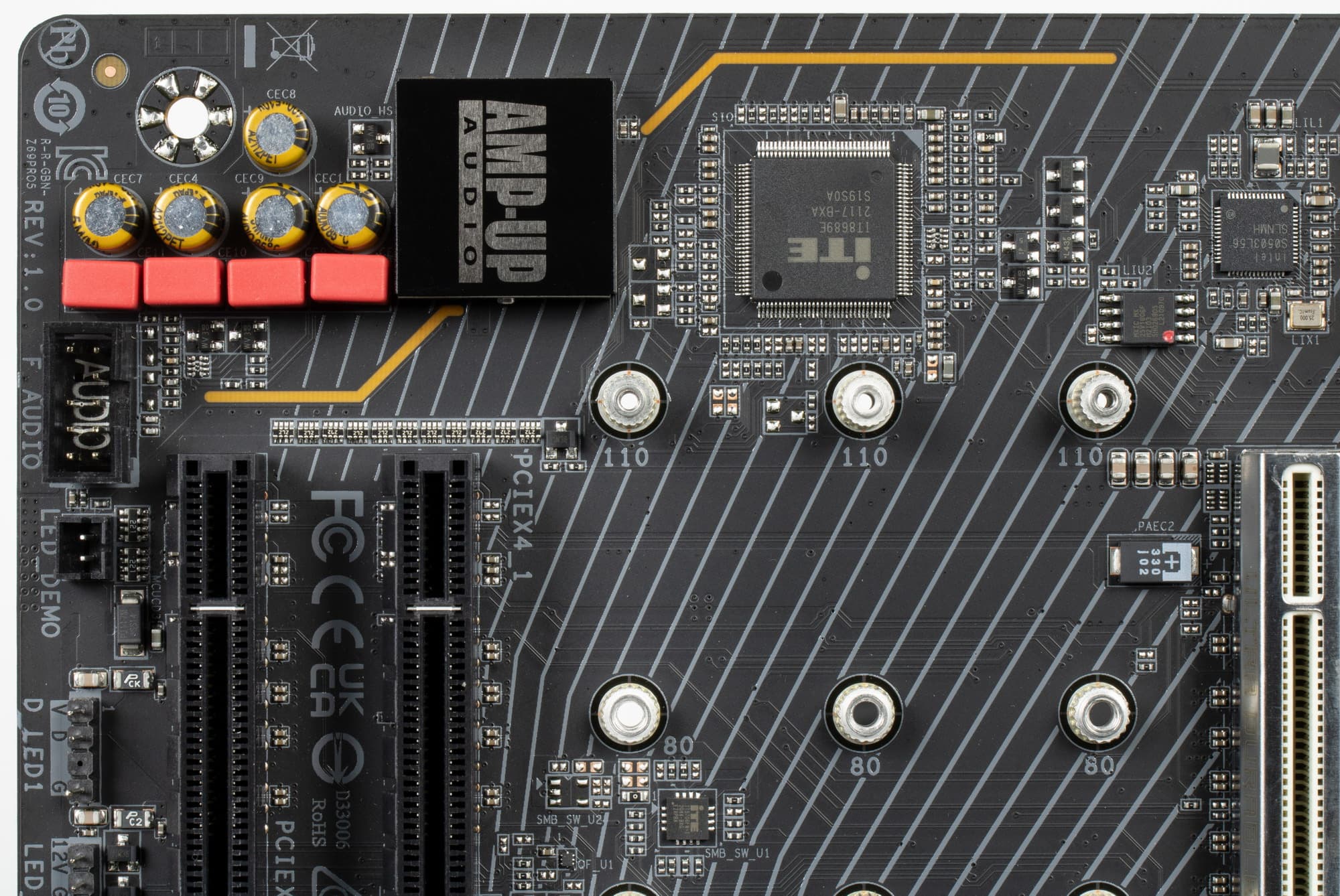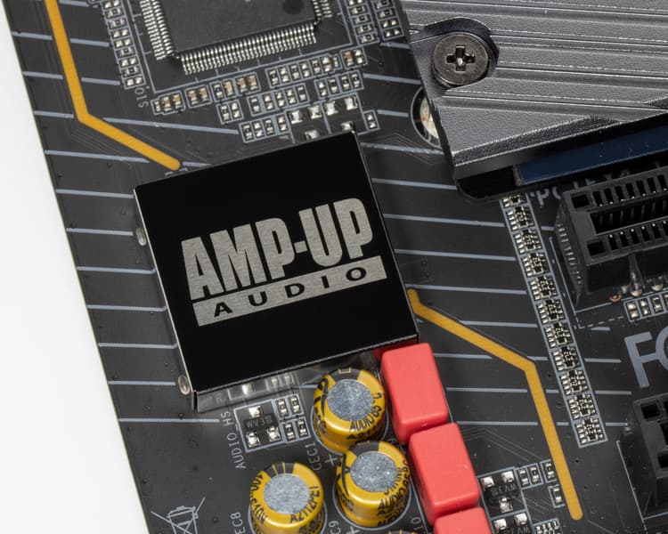 Мы знаем, что самым популярным в большинстве современных материнских платах звуковым кодеком является продукт от Realtek. В данном случае это ALC4080, обеспечивающий вывод звука по схемам до 7.1 с разрешением до 32 бит / 384 кГц. У платы он прикрыт металлическим «колпачком» AMP-UP Audio/
