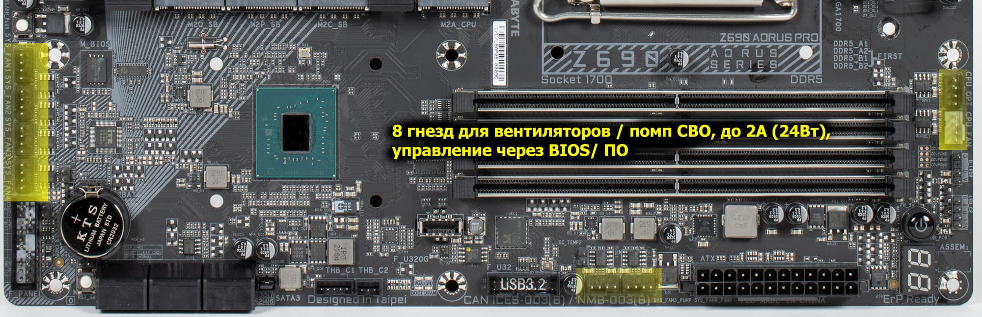Всего на плате есть 3 слота: один PCIe x16_1 (для видеокарт) и два PCIe x16_2/3 (но фактически имеющие по 4 линии). Если первый PCIe x16_1 подключен к CPU, то PCIe x16_2/3 подключены к Z690 и работают в режиме х4.