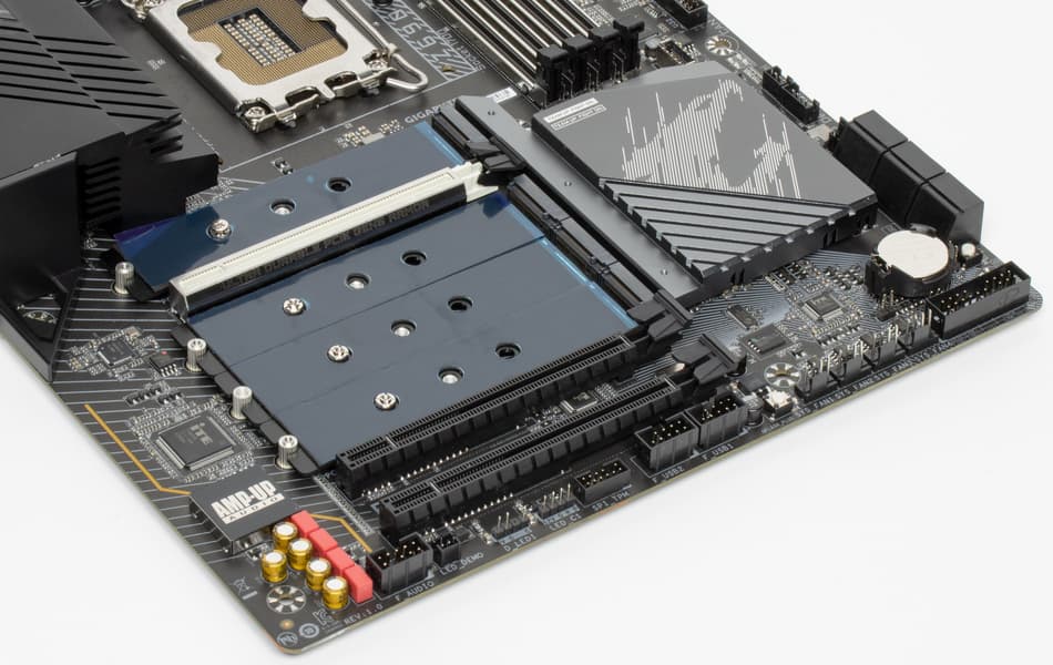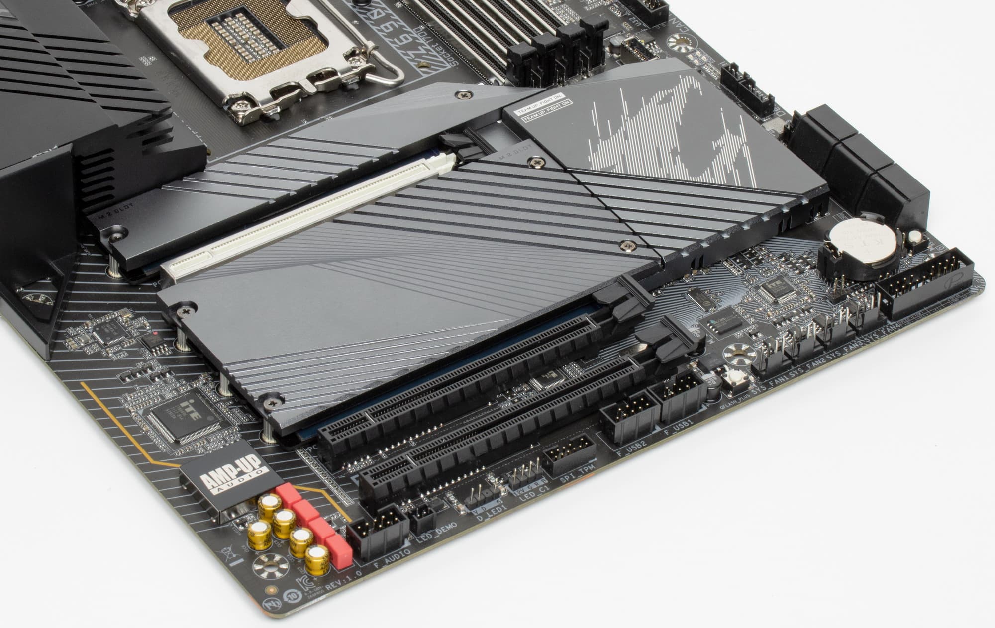 Как я уже упоминал ранее, M.2 слоты также имеют радиаторы: у верхнего — свой персональный радиатор. Остальные три слота покрыты общим радиатором, прижимающимся к чипсетному охладителю.