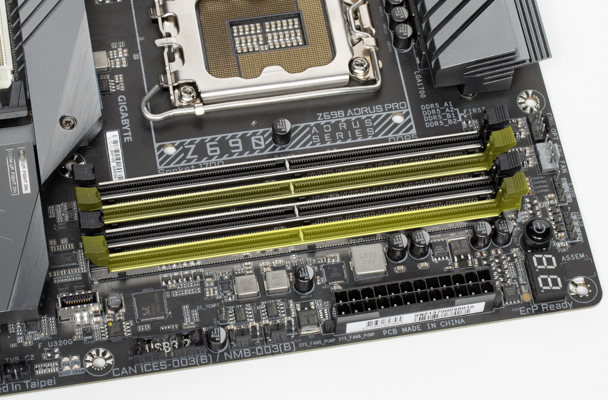 Для установки модулей памяти на плате Gigabyte имеется четыре DIMM-слота (для работы памяти в Dual Channel в случае использования всего 2 модулей их следует устанавливать в А2 и B2 (отмечены желтым цветом). Плата поддерживает небуферизованную память DDR5 (non-EСС), а максимальный объем памяти составляет 128 ГБ. Разумеется, поддерживаются профили XMP.