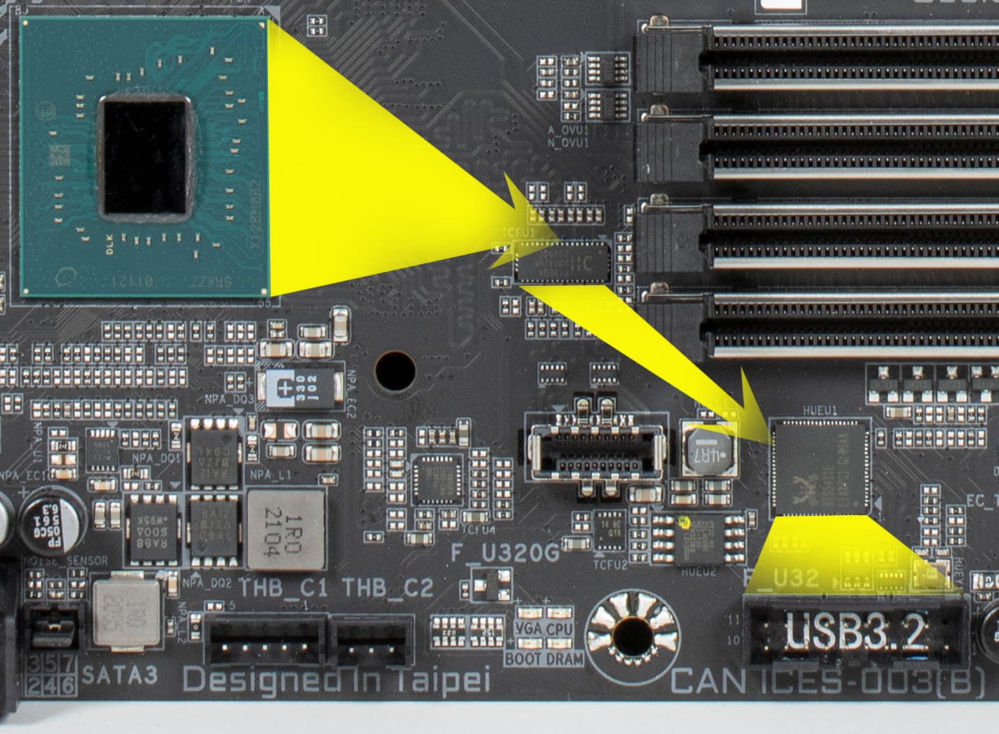 - 2 порта USB 3.2 Gen2x2: каждый реализован с помощью двух линий: USB 3.2 Gen2 от Z690 и ITE IT8851 (на каждый потрачена 1 линия USB 2.0) и представлены: внутренним портом Type-C (для подключения к соответствующему разъему на передней панели корпуса); второй представлен портом Type-C на задней панели;