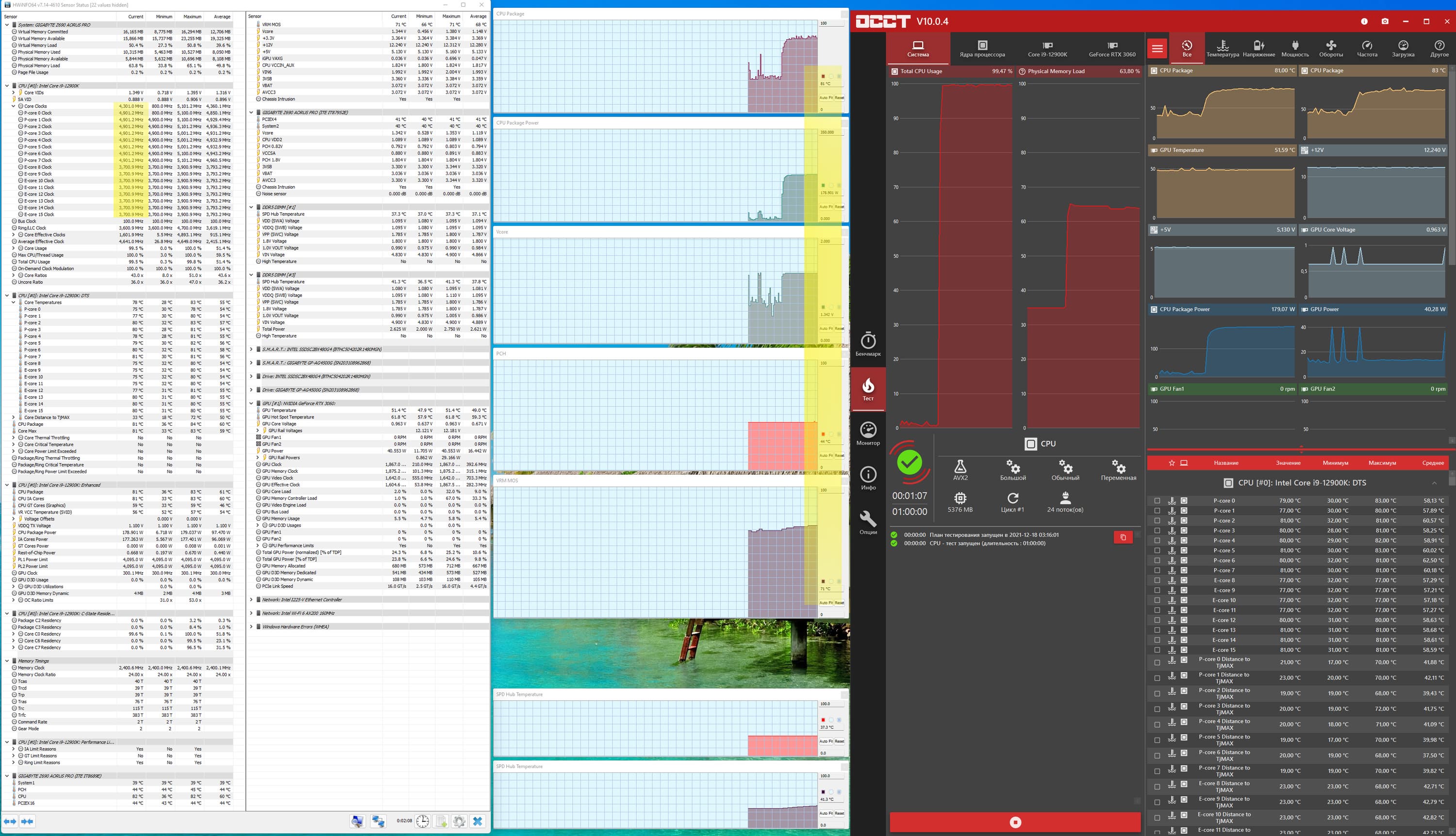 Ну что же, мы видим, что по умолчанию матплата выставила более чем приличный авторазгон процессора до 4,9 ГГц по P-ядрам. Подчеркну, что именно под очень тяжелой нагрузкой. А без оной частота по ядрам скачет и до 5,2 ГГц. А что касается Е-ядер, то там тоже неплохо: 3,7 ГГц под стресс-нагрузкой, и 3,9 ГГц без оной. Нагрев в пределах нормы по всем параметрам. Стоит напомнить, что Р-ядра — это обычные всем привычные ядра, имеющие по 2 потока каждый, «Р» — означает Performance, то есть производительные. «Е» — это энергоэффективные ядра, так называемые, малые ядра, у них по 1 потоку.