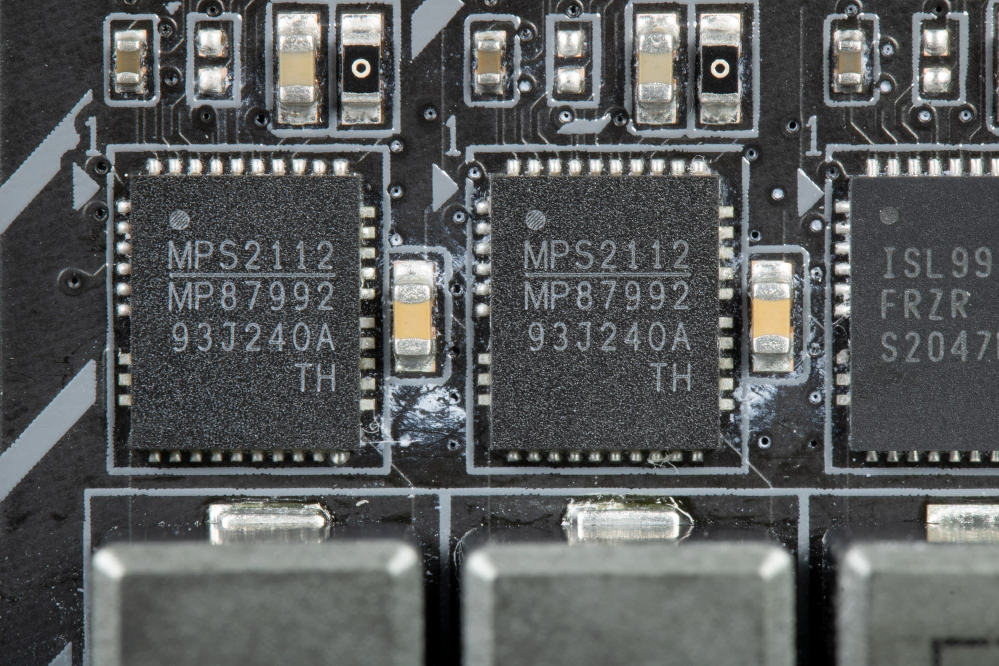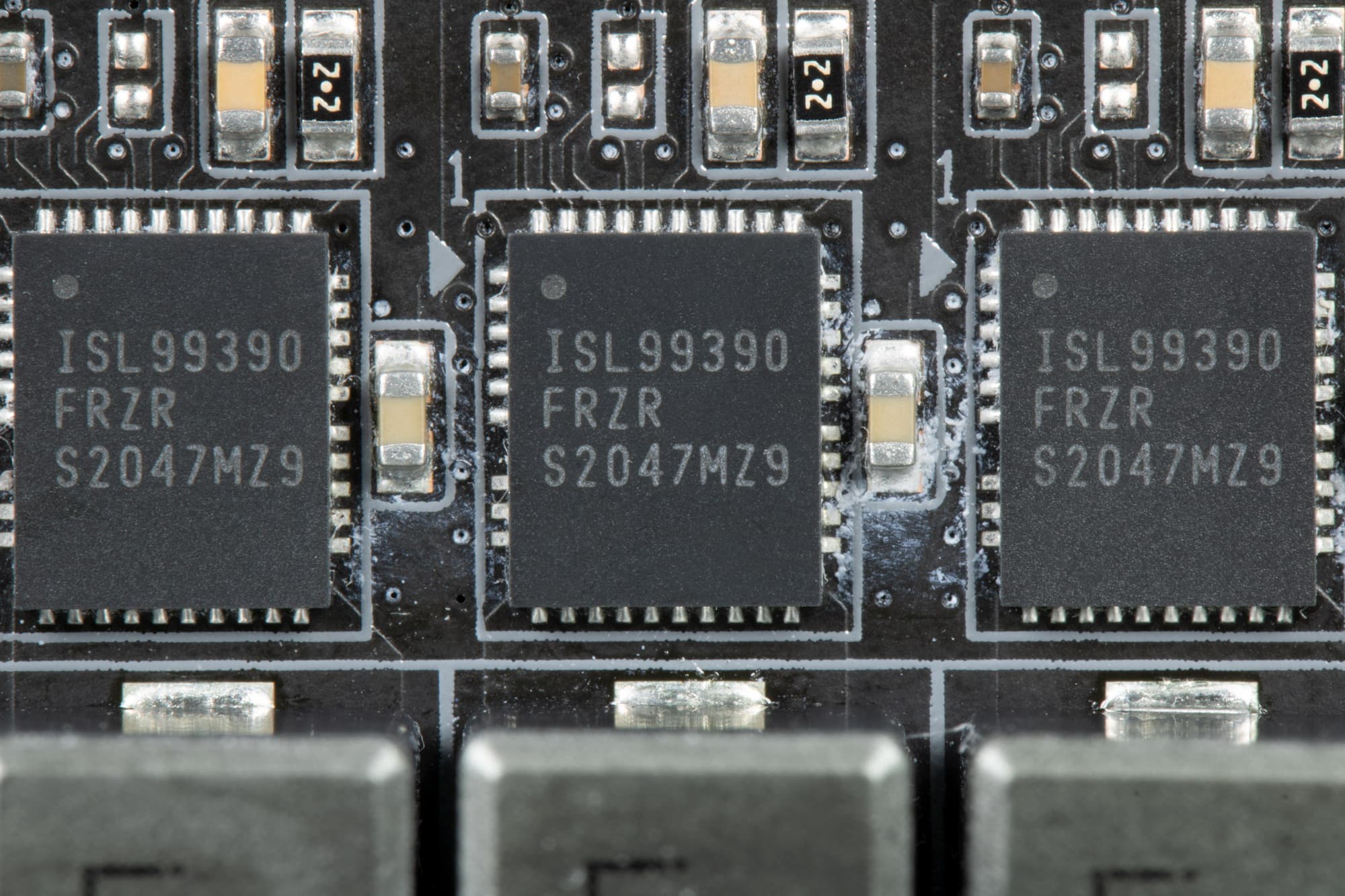 Каждый канал фазы для VCore и iGPU имеет суперферритовый дроссель и MOSFET Renesas (-ex Intersil) ISL99390 на 90 А.
