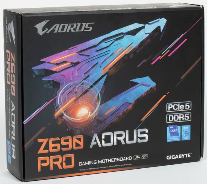Карта поставляется в стандартной коробке из твердого картона с фирменным дизайном Aorus. На лицевой стороне особо отмечено, что данный вариант материнки предназначен для работы с DDR5 памятью, ибо еще имеется вариант Z690 Aorus Pro DDR4 (оба варианта плат полностью идентичны по наличию и расположению периферии).