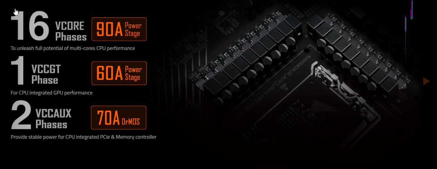 16 фаз на ядро процессора, 1 фаза VCCGT (iGPU) — на интегрированную графику в процессор и 2 фазы на VCCIO (VCCAUX) — блок управления контроллером памяти и ввода/вывода .