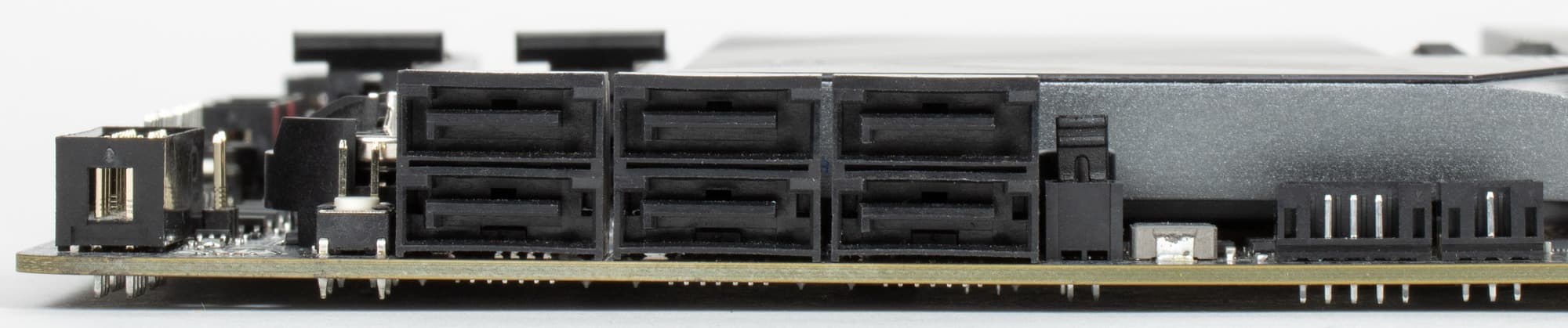 Всего у платы 6 разъемов Serial ATA 6 Гбит/с + 4 слота для накопителей в форм-факторе M.2. Порты SATA промаркированы, начиная с 2, реализованы через чипсет Z690 и поддерживают создание RAID.