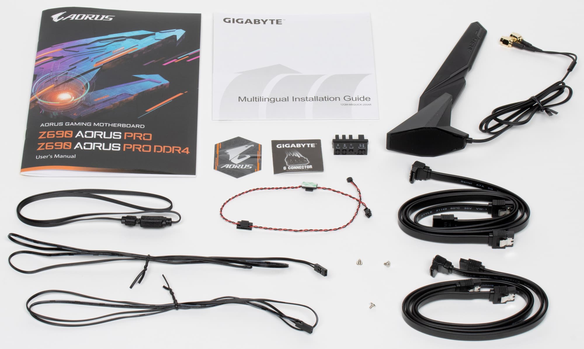 Комплект поставки расположен в отсеке под платой. Кроме традиционных элементов типа руководства пользователя и кабелей SATA, имеются: антенна встроенного Wi-Fi/BT-модуля, винтики для М.2 слотов, внешние термодатчики и датчик шума, удлинитель подсветки, фирменные адаптер G-connector (для передней панели корпуса) и стикеры.