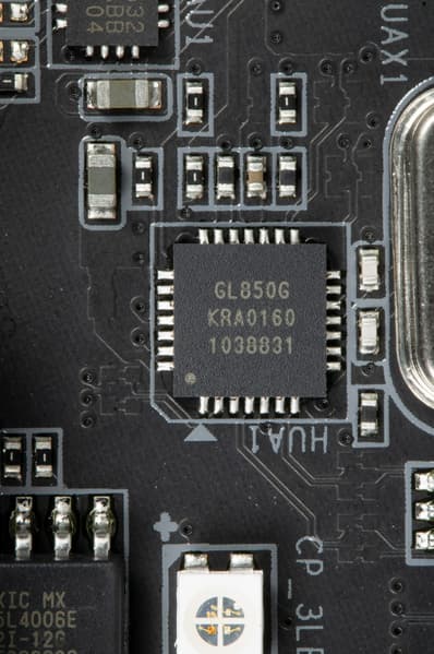 - 8 портов USB 2.0/1.1: все реализованы через два контроллера Genesys Logic GL850G (на каждый потрачена 1 линия USB 2.0) и представлены: 4 – портами Type-A на задней панели (черные); остальные 4 – двумя внутренними разъемами (каждый на 2 порта).