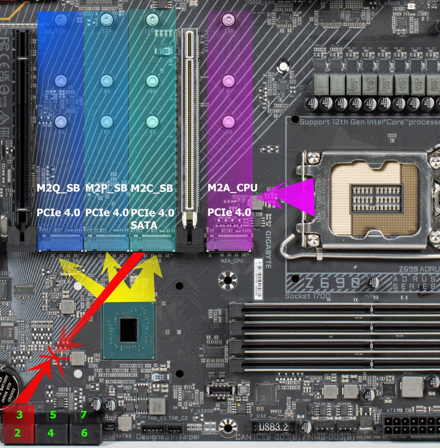Второй, третий и четвертый слоты M.2 (M2P_SB, M2Q_SB, M2C_SB) получают данные от чипсета Z690 (PCIe 4.0), а первый M2A_CPU — от CPU (PCIe 4.0). При этом только М2C_SB поддерживает модули с любым интерфейсом, а все остальные работают с модулями только с PCIe интерфейсом. Следует иметь в виду, что М2C_SB делит ресурсы с портами SATA_2/3.