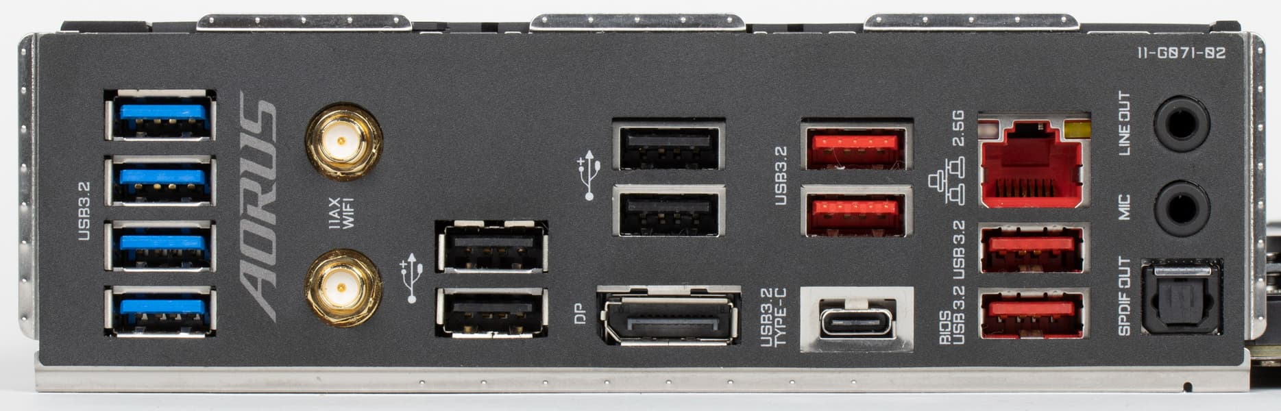 | USB-порты | 4 × USB 2.0: 2 внутренних разъема на 4 порта (GL850+Z690) 4 × USB 2.0: 4 порта Type-A (черные) (GL850+Z690) 2 × USB 3.2 Gen1: 1 внутренний разъем на 2 порта (RTS5411) 4 × USB 3.2 Gen1: 4 порта Type-A (синие) (RTS5411) 1 × USB 3.2 Gen2x2: 1 внутренний разъем Type-C (Z690+IT8851) 1 × USB 3.2 Gen2x2: 1 порт Type-C (Z690+IT8851) 2 × USB 3.2 Gen2: 4 портa Type-A (красные) (Z690) |