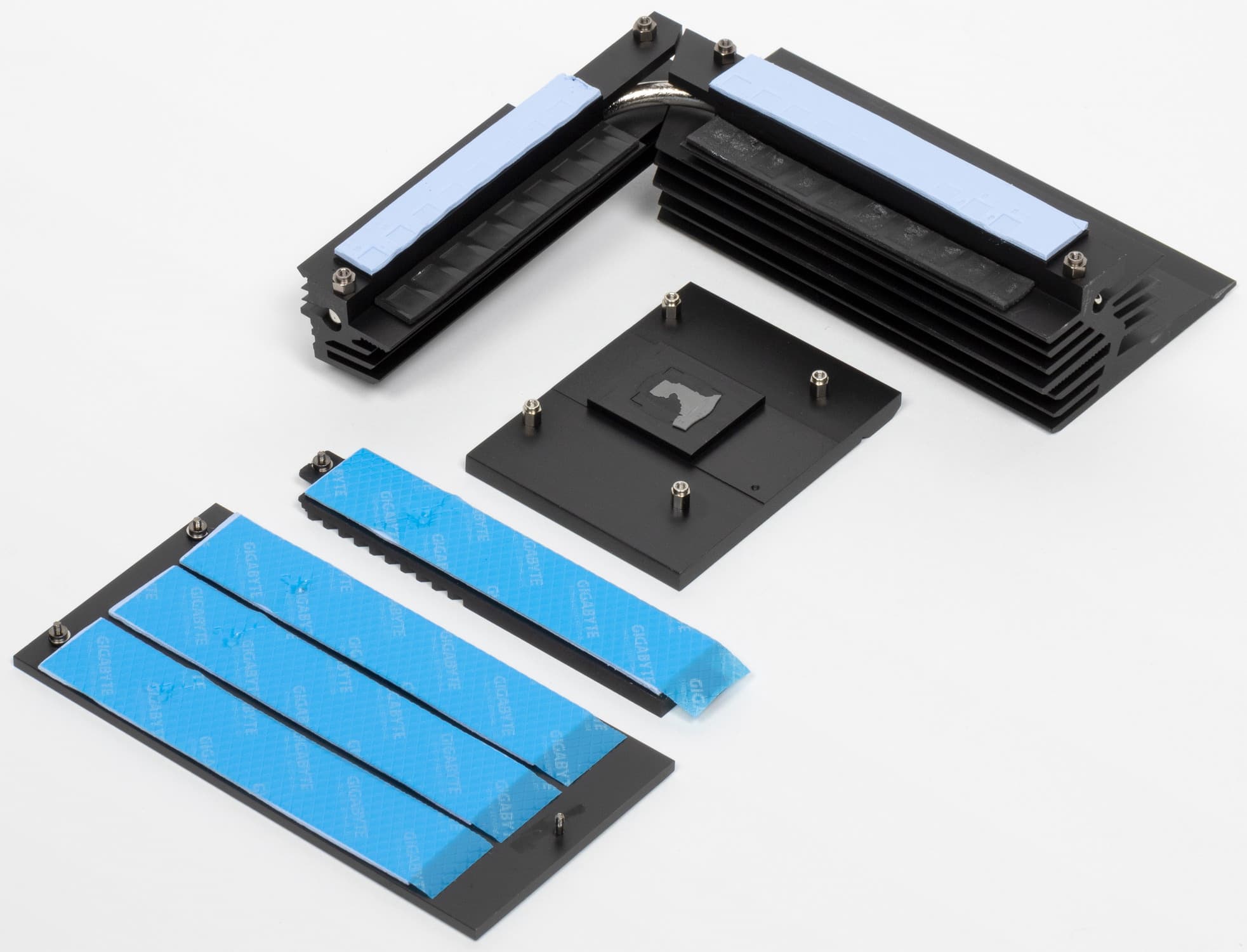 Все M.2 слоты имеют радиаторы. Верхний M2A_CPU обладает отдельным радиатором, когда как остальные все слоты M.2 имеют общий радиатор.