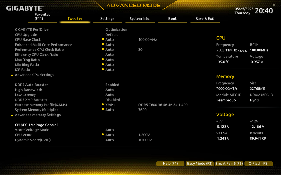 В режиме авторазгона мы получили от 5 до 5,5 ГГц по P-ядрам, и 4.3 ГГц по всем Е-ядрам. Напомню, что Р-ядра — это обычные всем привычные ядра, имеющие по 2 потока каждый, «Р» — означает Performance, то есть производительные. «Е» — это энергоэффективные ядра, так называемые, малые ядра, у них по 1 потоку.