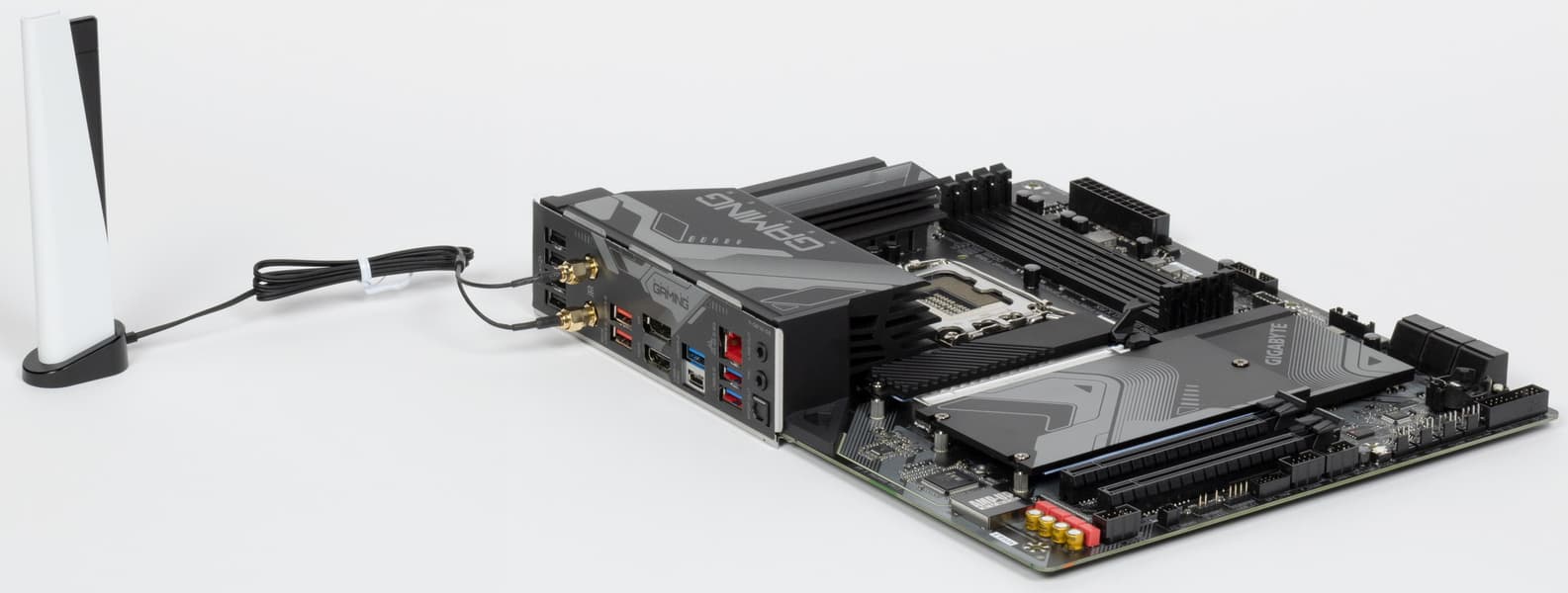 Имеется и комплексный беспроводной адаптер на контроллере Intel AX211NGW, через который реализованы Wi-Fi 6E (802.11a/b/g/n/ac/ax) и Bluetooth 5.2. Он установлен в слот M.2 (E-key), и его разъемы для привинчивания выносных антенн выведены на заднюю панель.