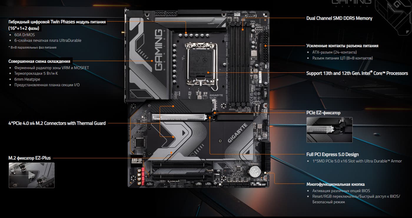У платы 17 портов USB разных видов, включая 3 очень быстрых USB 3.2 Gen2, а также один USB 3.2 Gen2×2 в виде порта Type-C, 3 слота PCIe х16, один из них получает от процессора 16 линий PCIe версии 5.0, два других работают в режиме x4 (подключены к Z790), а также 4 слота M.2: один слот подключен напрямую к процессору линиями PCIe 4.0, три других подключены к чипсету, при этом два — линиями PCIe 4.0, а последний — линиями PCIe 3.0 (он делит ресурсы с двумя портами SATA). В арсенале платы есть 6 портов SATA и 6 разъемов для вентиляторов. Система питания процессора достаточно мощная, способная обеспечить работу любых совместимых процессоров с некоторым запасом на разгон (надо лишь включить нужные настройки в BIOS Setup). Плата имеет грамотную систему охлаждения каждого потенциально греющегося элемента, включая накопители в слотах M.2. Сетевые возможности неплохие: быстрый проводной контроллер 2,5 Гбит/с и один современный беспроводной. В числе плюсов платы можно упомянуть возможности для подключения подсветки в виде дополнительных ARGB/RGB-устройств.