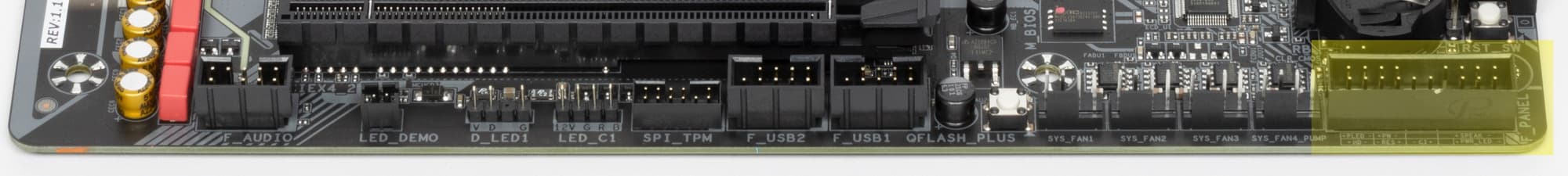 | Прочие внутренние элементы | 24-контактный разъем питания ATX 2 8-контактный разъем питания EPS12V 1 слот M.2 (E-key), занят адаптером беспроводных сетей 1 разъем для подключения порта USB 3.2 Gen2 Type-C 1 разъем для подключения 2 портов USB 3.2 Gen1 2 разъема для подключения 4 портов USB 2.0 6 разъемов для подключения 4-контактных вентиляторов и помп ЖСО 2 разъема для подключения неадресуемой RGB-ленты 2 разъема для подключения адресуемой ARGB-ленты 1 разъем аудио для передней панели корпуса 1 разъем сброса CMOS 1 разъем для устройств безопасности TPM 2 разъема для дискретных карт Thunderbolt 1 разъем для подключения управления с передней панели корпуса 1 кнопка перепрошивки BIOS — Q Flash Plus 1 кнопка перезагрузки Reset |