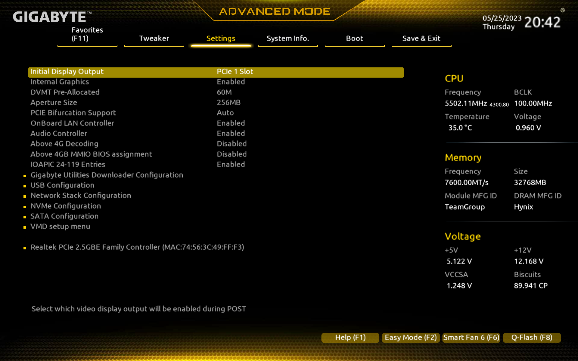Формально имеется поддержка памяти DDR5 до 5600 МГц, однако всем хорошо известно, и производители материнских плат это активно рекламируют: через XMP-профили сейчас можно использовать частоты до 7000 и выше МГц. В частности данная плата поддерживает частоты до 7600 МГц.
