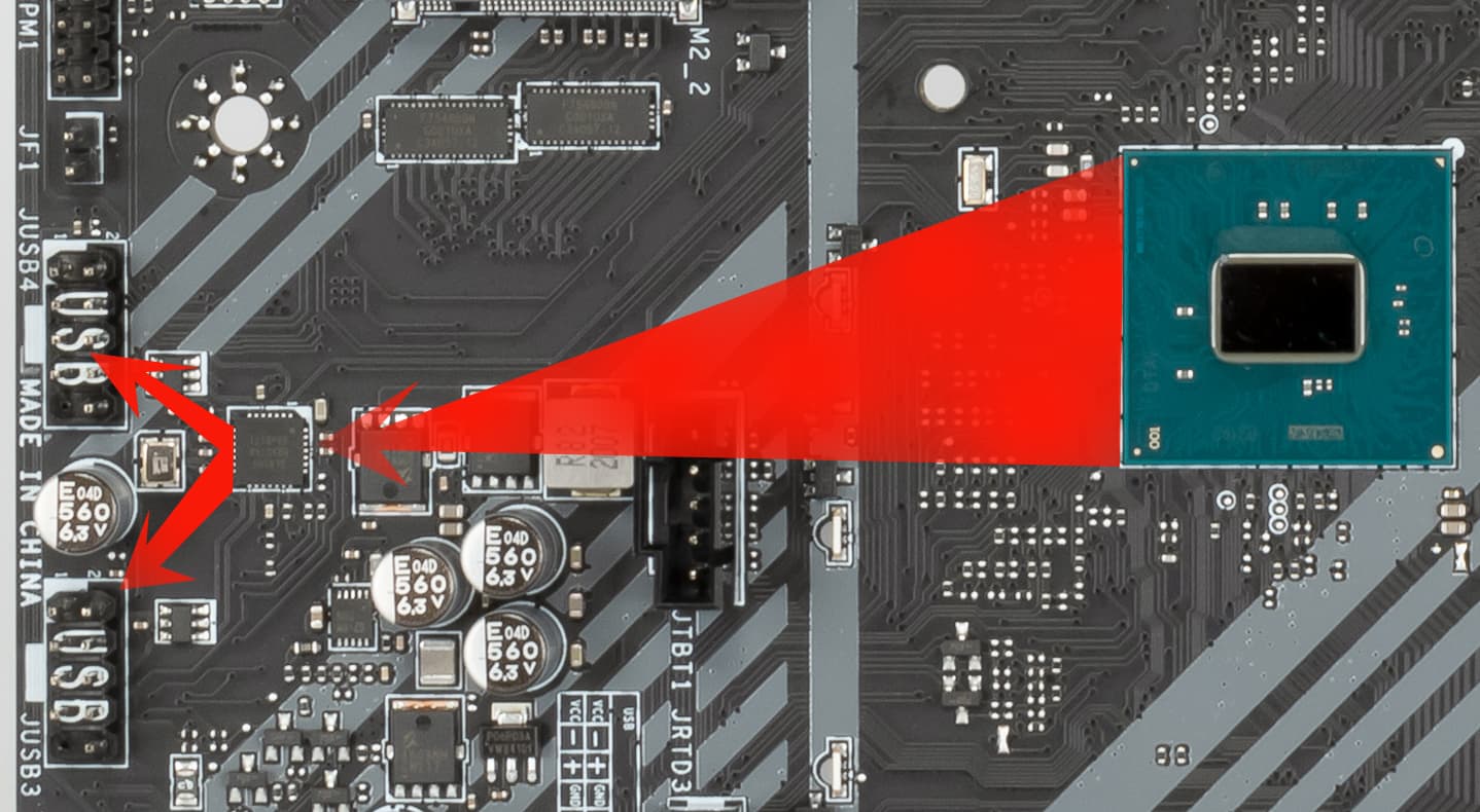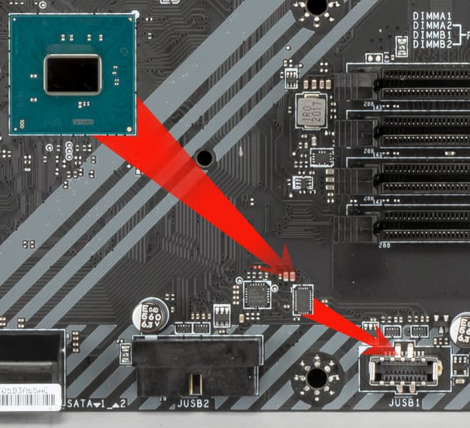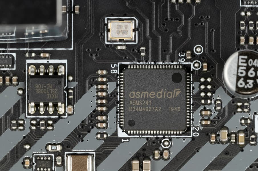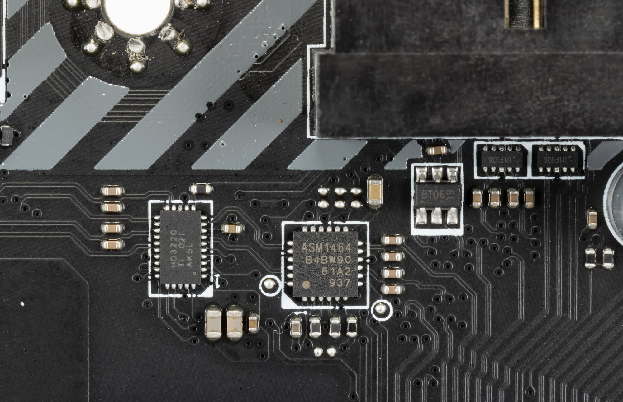 А два порта USB 3.2 Gen1, реализованные через внутренний разъем, имеют подобный ре-драйвер ASM1464 от ASMedia.