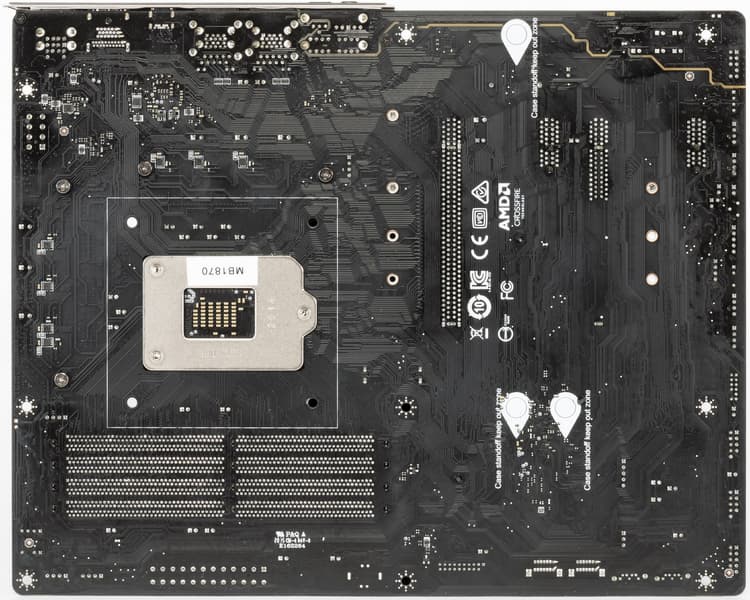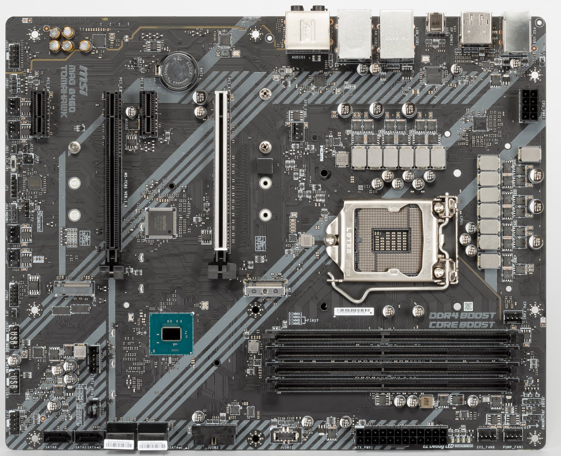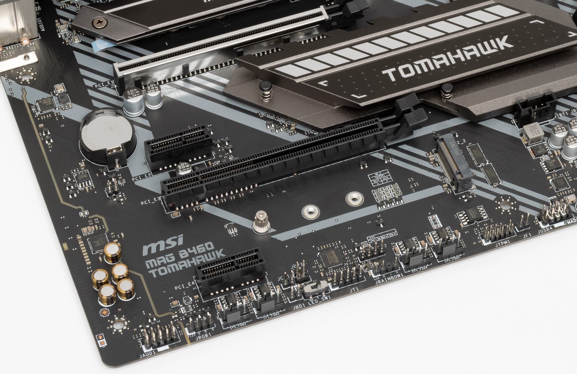 Форм-фактор ATX имеет размеры до 305×244 мм, а E-ATX — до 305×330 мм. Материнская плата MSI MAG B460 Tomahawk имеет размеры 305×244 мм, поэтому выполнена в форм-факторе ATX, и на ней имеются 9 монтажных отверстий для установки в корпус. Печатная плата имеет 6 слоев.