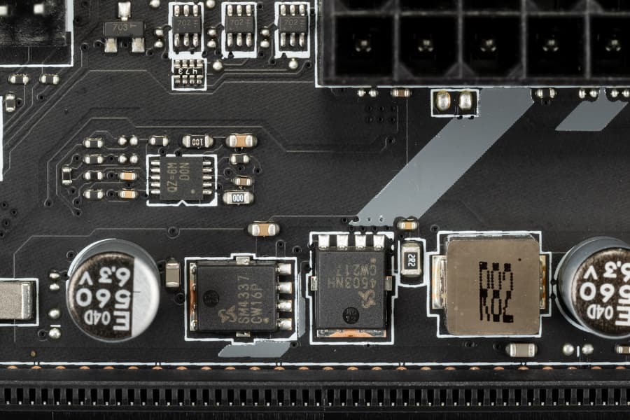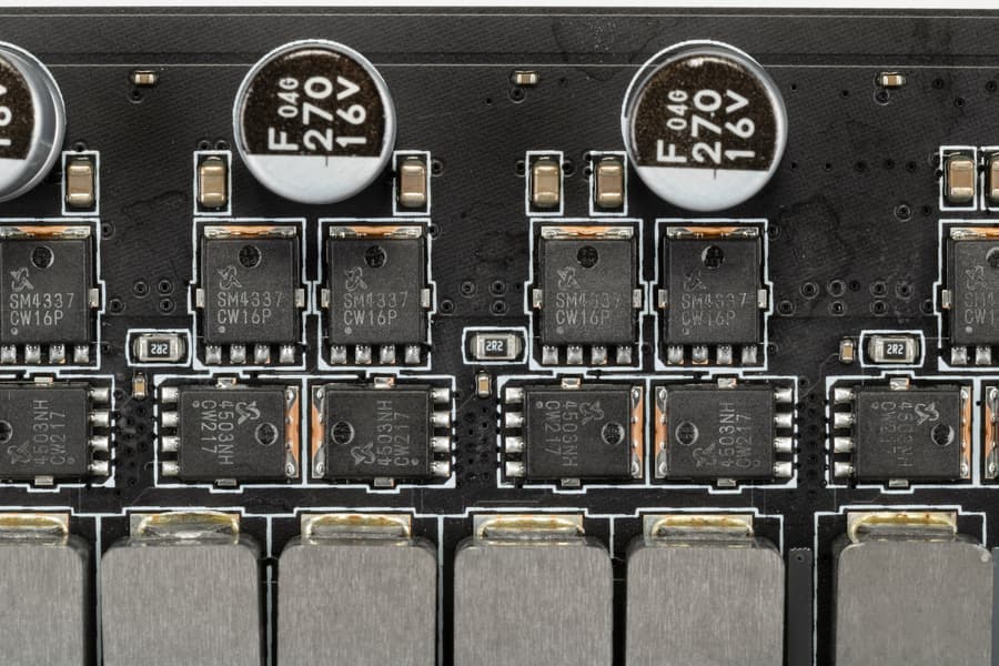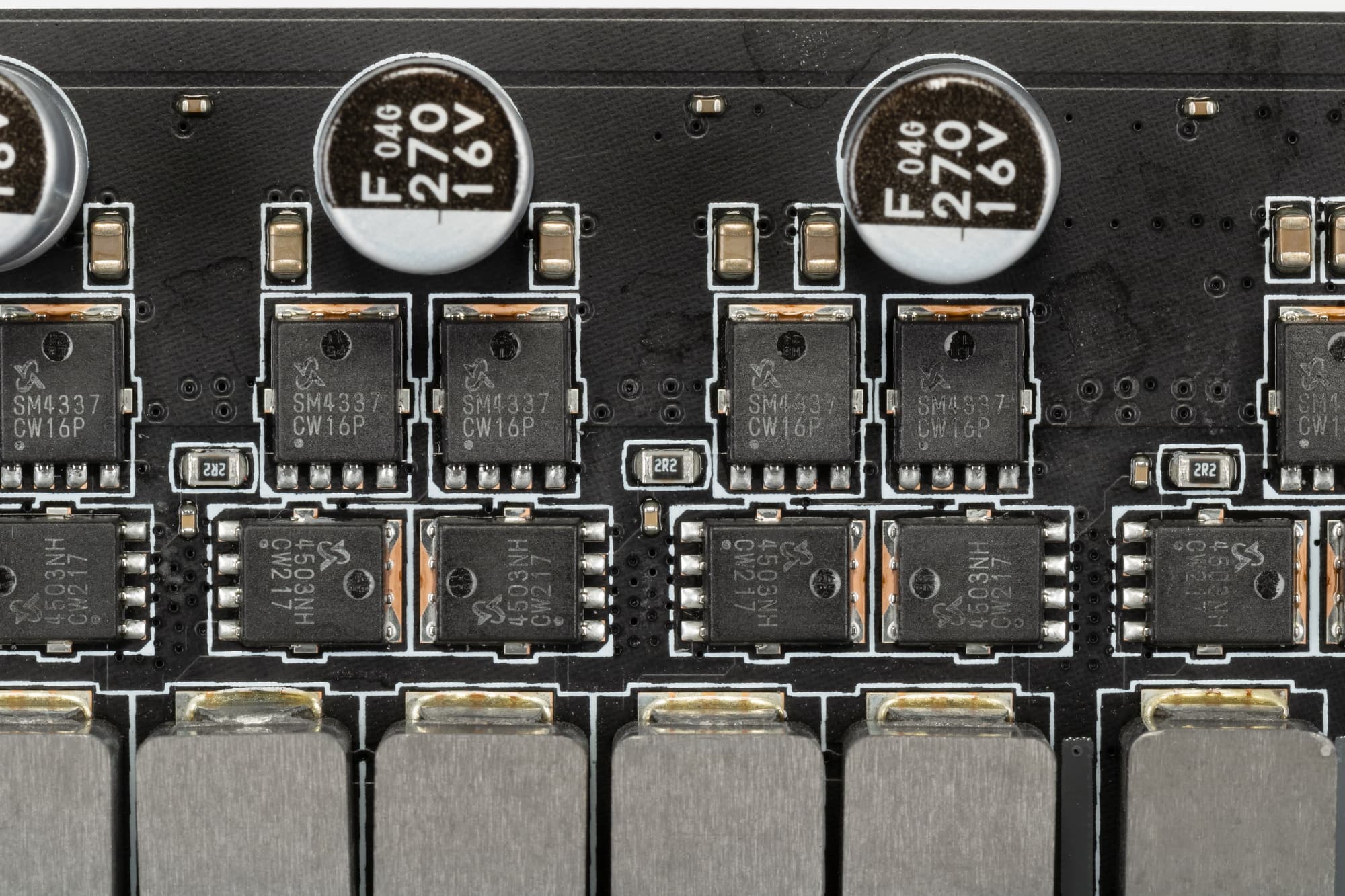 Каждый канал фазы имеет суперферритовую катушку и 2 пары транзисторов SM4337NSKP и SM4503NHKP от Sinopower Semiconductor, рассчитанные на токи до 80А.