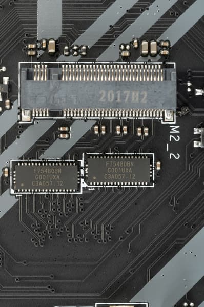 Напомню, что порт SATA_1 делит ресурсы с портом M.2_1, а в свою очередь порт М.2_2 делит ресурсы со слотом PCIe_16_2, поэтому имеются мультиплексоры F75480BN от TE Connectivity Ltd.