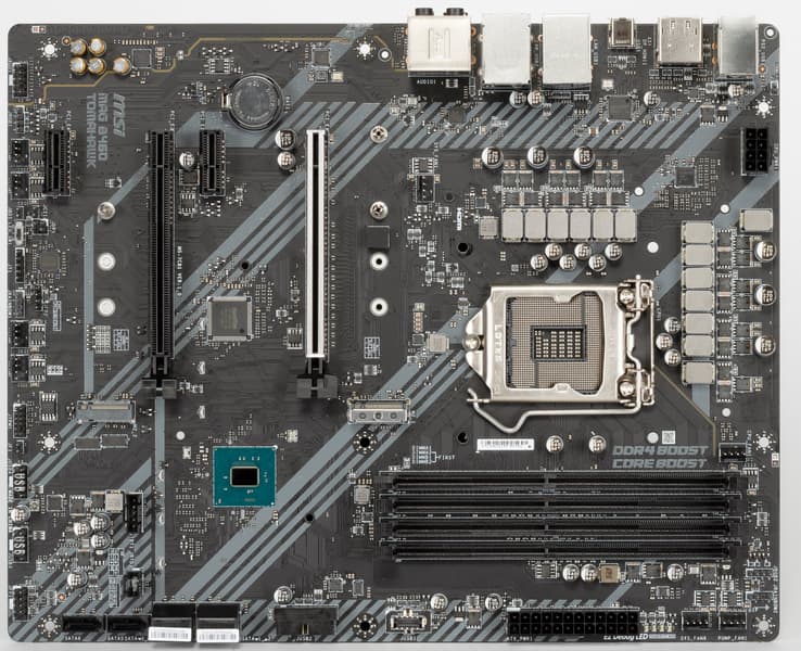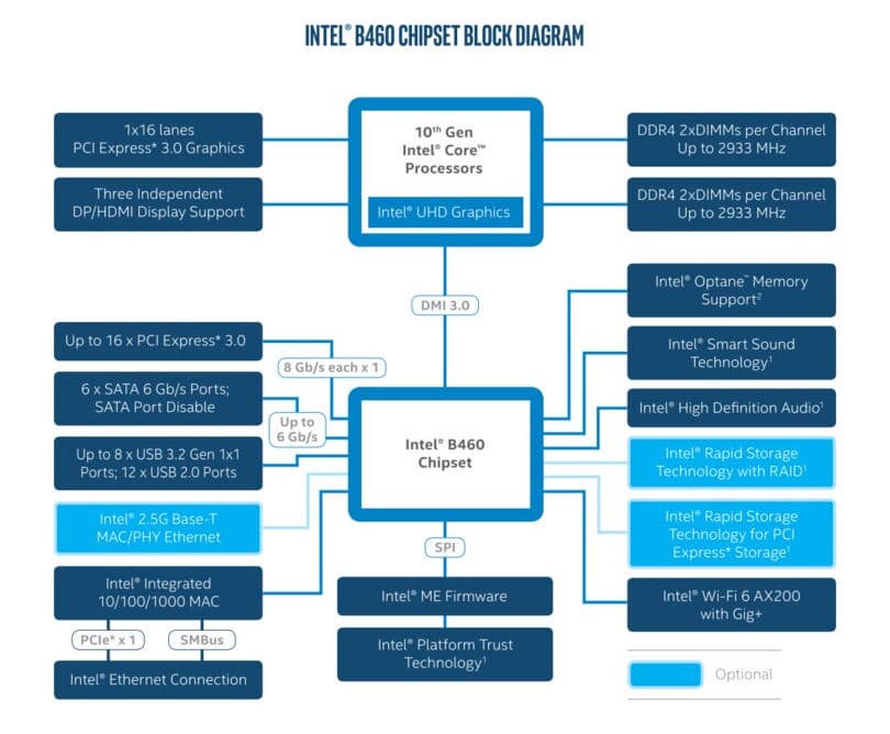 Процессоры Intel Core 10-го поколения (совместимые с сокетом LGA1200 и поддерживаемые B460) имеют 16 линий ввода-вывода (включая PCIe 3.0), не имеют USB и SATA портов. При этом взаимодействие с B460 идет по особому каналу Digital Media Interface 3.0 (DMI 3.0), и линии PCIe на это не расходуются. Все PCIe линии процессора идут на слоты расширения PCIe. Serial Peripheral Interface (SPI) используется для взаимодействия с системой UEFI/BIOS, а шина Low Pin Count (LPC) — для связи с устройствами ввода/вывода, не требующими высокой пропускной способности (контроллерами вентиляторов, TPM, старой периферии).