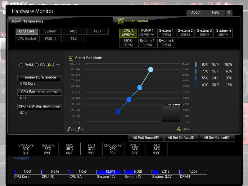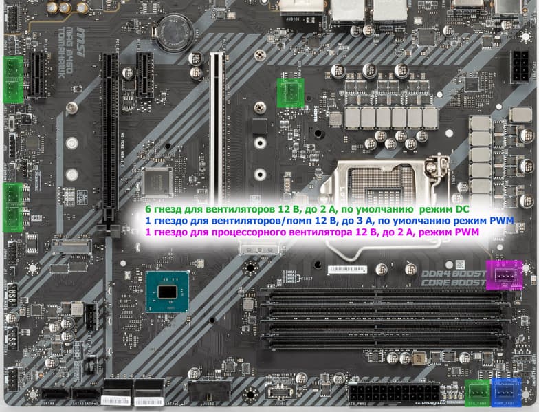 Через ПО или BIOS контролируется все 8 гнезд для подключения воздушных вентиляторов или помп: могут управляться как через ШИМ, так и банальным изменением напряжения/тока.