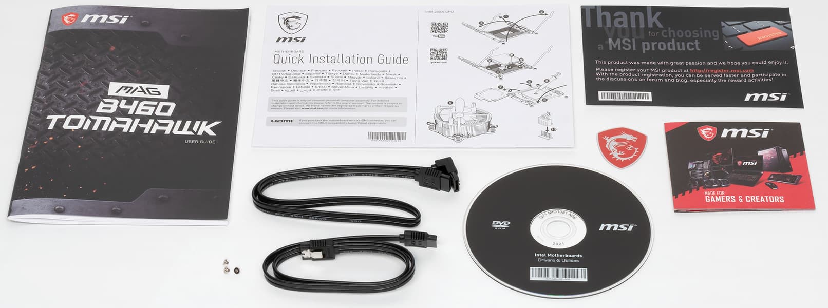 MSI MAG B460 Tomahawk поставляется в стандартной коробке с фирменным дизайном серии MAG с подчеркиванием некоторого упора MAG в очень надежную комплектуху. Внутри этой коробки есть традиционные отсеки: для самой материнской платы и остального комплекта.