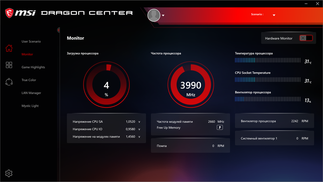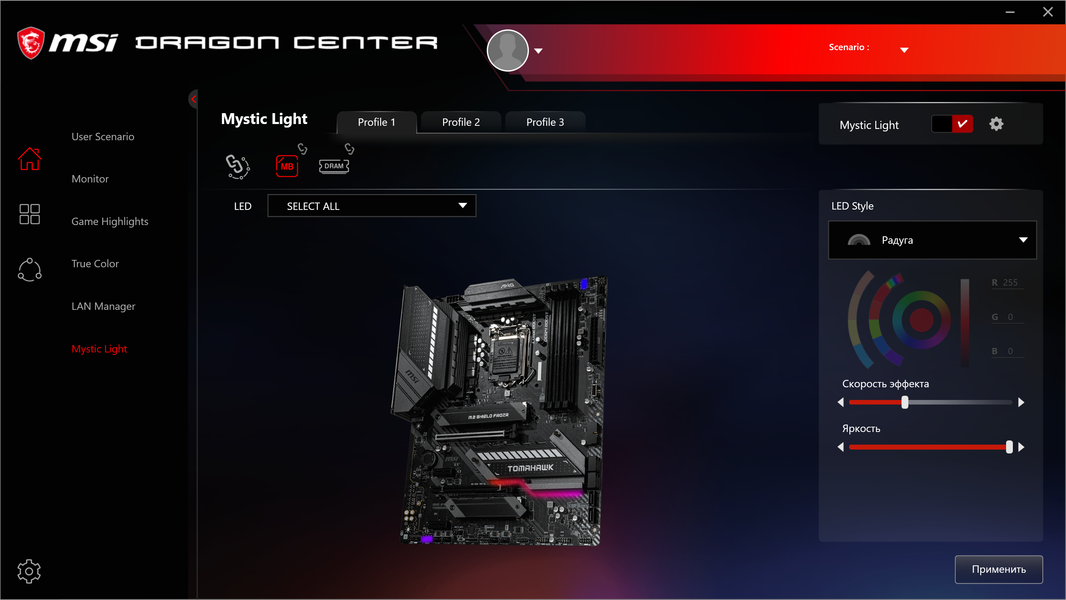 Топовые платы MSI (как и других производителей) обычно имеют красивую подсветку. Разумеется, платы более низких ценовых уровней имеют урезанные варианты, или полное отсутствие встроенной подсветки. И все же эта плата может похвастаться скромным сиянием чего-то там такого из-под чипсетного радиатора и не более того. А также мы помним, что есть 4 разъема для подключения внешней подсветки, и всем этим можно управлять через программу Dragon Center.