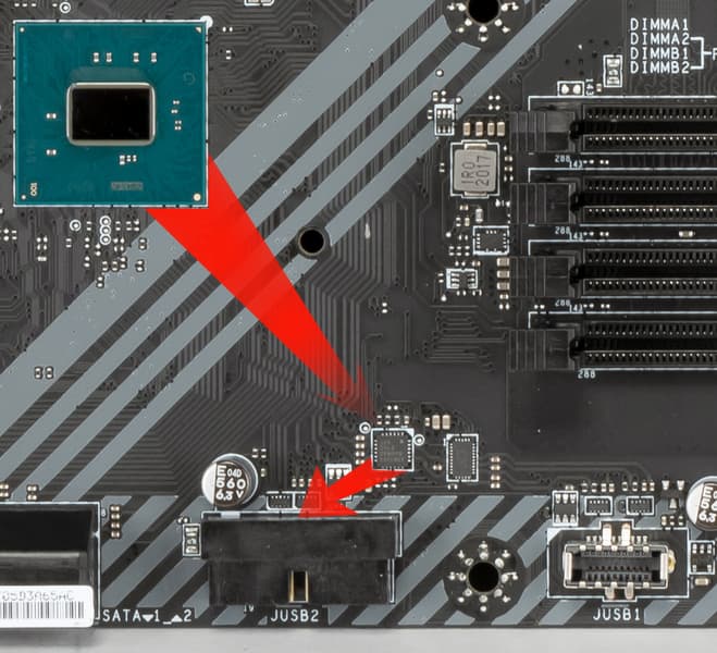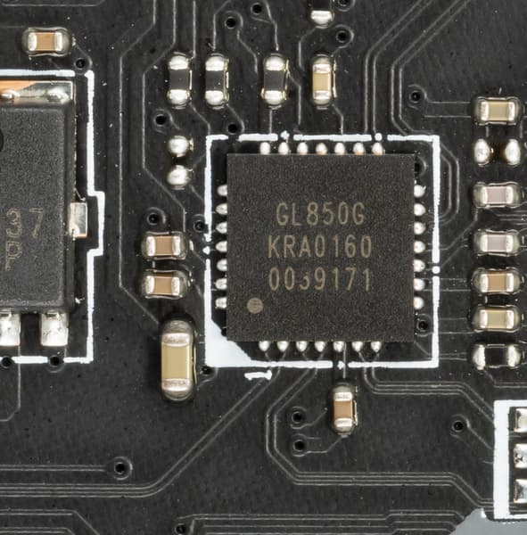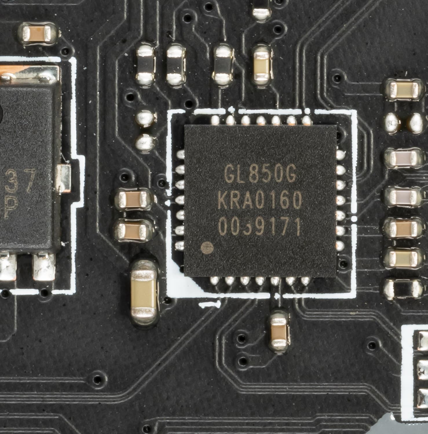 - 6 портов USB 2.0/1.1: 4 реализованы через контроллер Genesys Logic GL850G (на него потрачена 1 линия USB 2.0 от B460) и представлены двумя внутренними разъемами (каждый на 2 порта); еще 2 реализованы через B460 и представлены портами Type-A на задней панели (черные).
