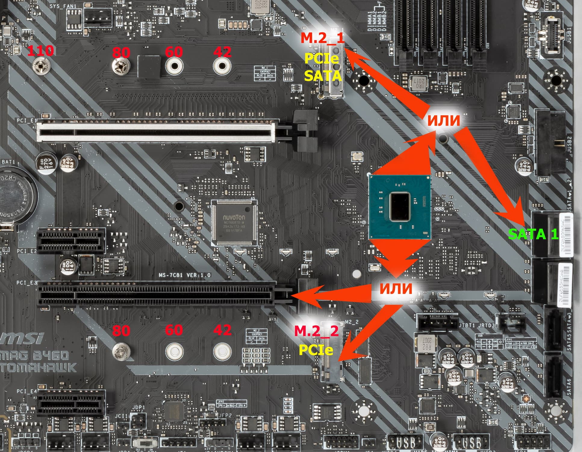- Переключатель: или порты SATA_1 (1 линия), или слот M.2_1 (4 линии): максимум 4 линии;