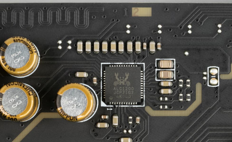 Данная аудиоподсистема мало чем отличается от традиционных. Мы знаем, что практически во всех современных материнских платах звуком заведует аудиокодек Realtek, в данном случае применен его чуть упрощенный вариант ALC1200. Он обеспечивает вывод звука по схемам до 7.1.
