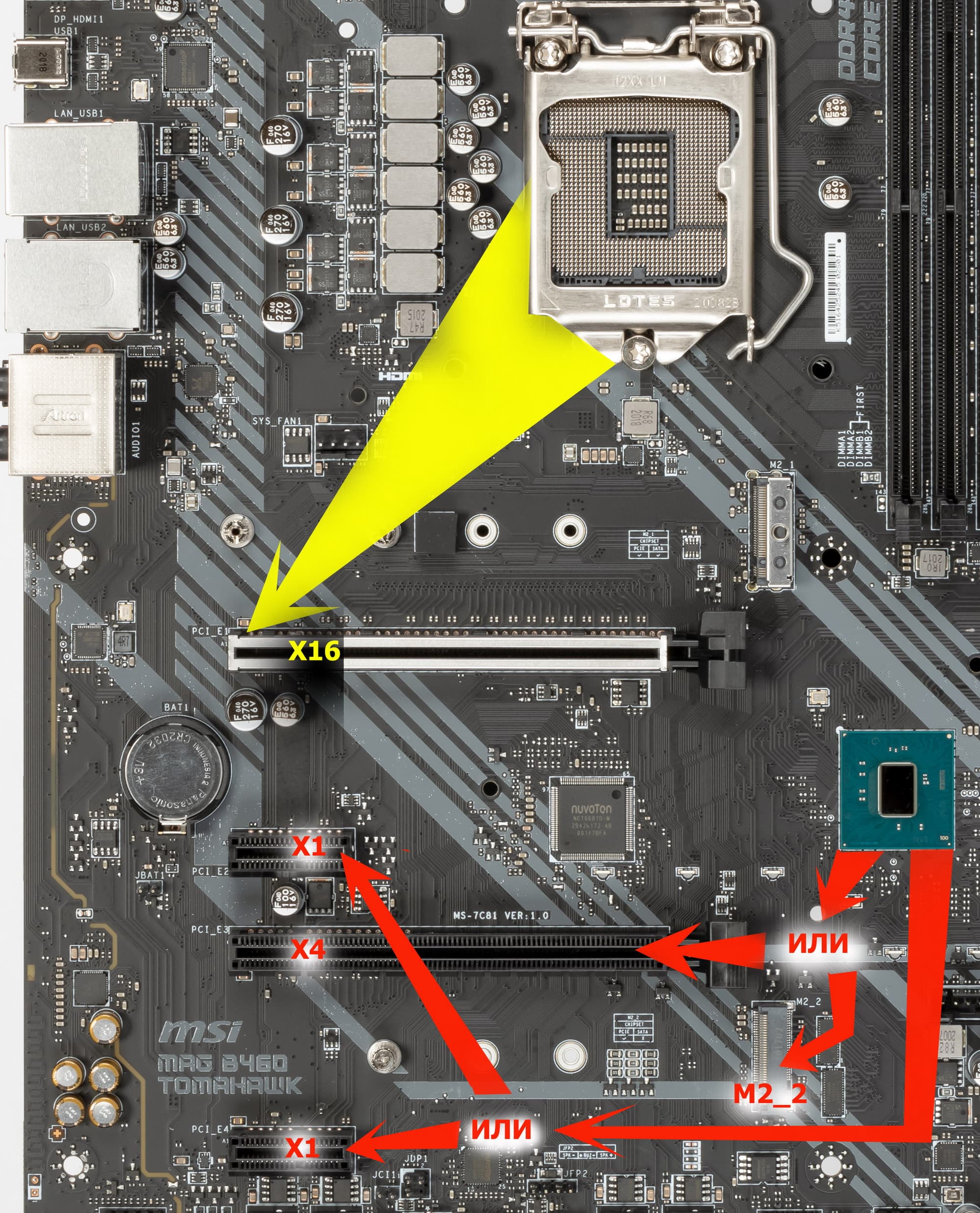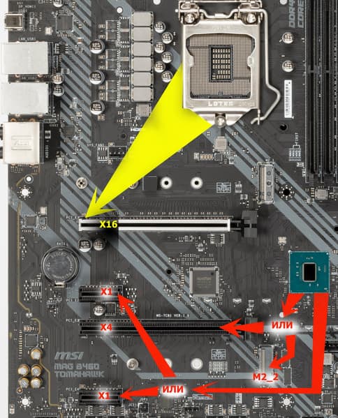 Переходим к PCIe слотам. Про те, которые «кормит» не чипсет B460, а процессор, я уже выше сказал.