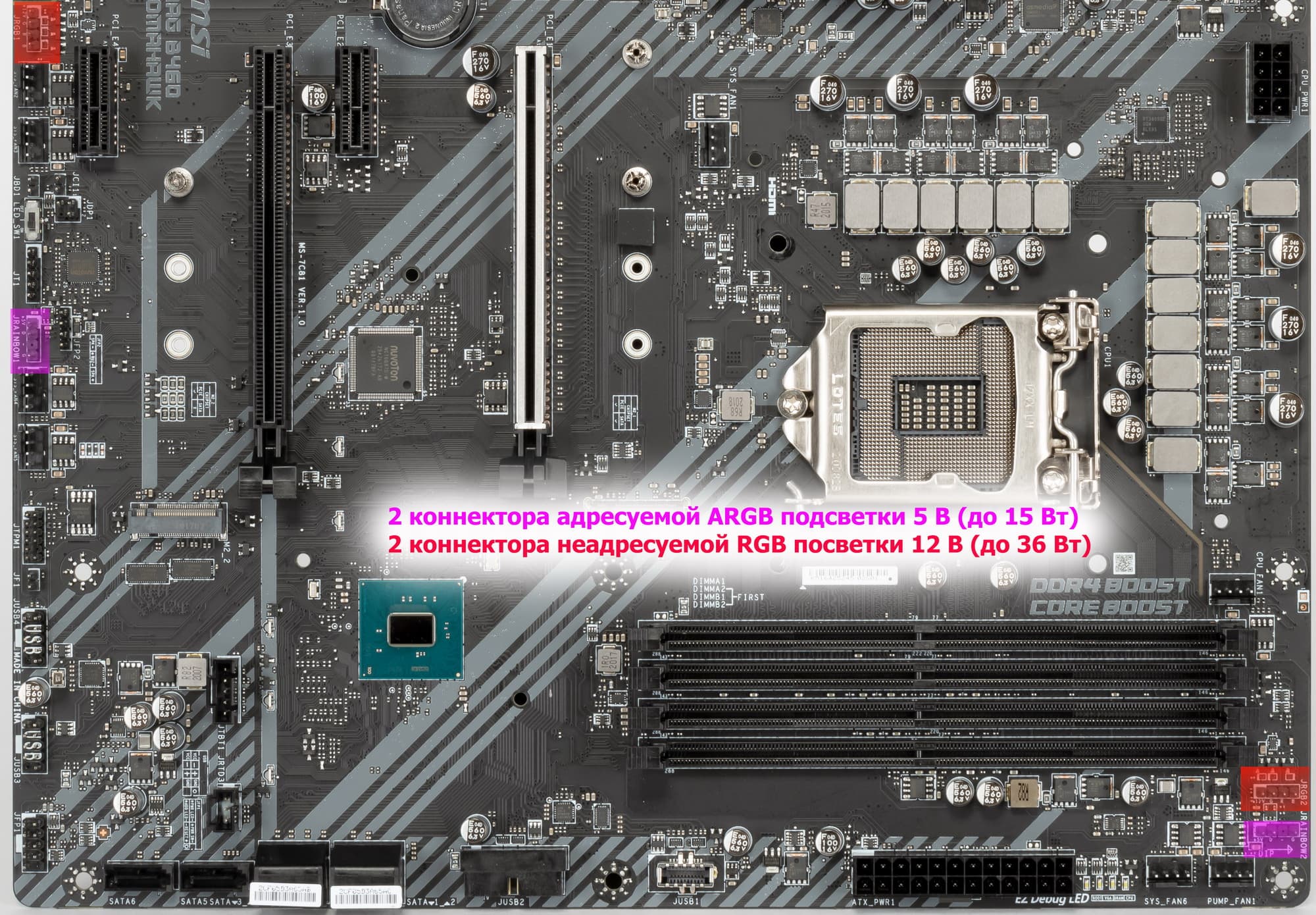 Продолжая разговор о световых штучках, надо упомянуть и возможности материнской платы по подключению RGB-подсветки. Имеется 4 разъема для подключения любых устройств этого плана: 2 разъема для подключения адресуемых (5 B 3 A, до 15 Вт) ARGB-лент/устройств, 2 разъема неадресуемых (12 В 3 А, до 36 Вт) RGB-лент/устройств. Разъемы объединены в пары, разнесенные на противоположные края платы.