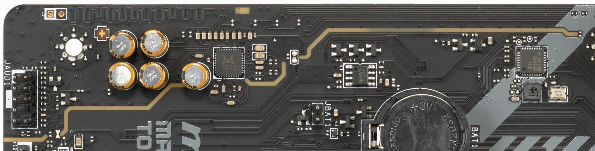 Аудиотракт вынесен на угловую часть платы, не пересекается с другими элементами, левый и правый каналы разведены по разным слоям печатной платы. Все аудиоразъемы на задней панели имеют похожее на позолоченное покрытие, но не сохранена привычная цветовая окраска разъемов (которая неплохо помогает подключать нужные штекеры без вглядывания в их наименование).