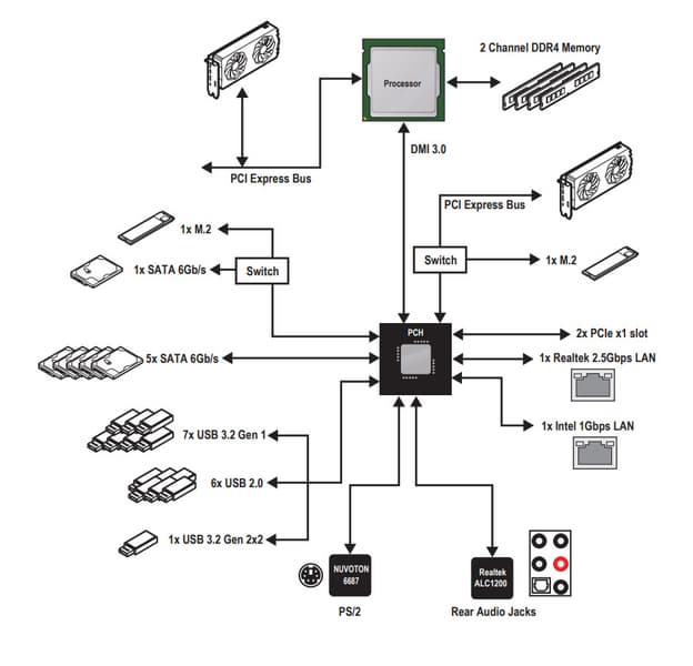 | Сетевые контроллеры | 1 × Realtek RTL8125B (Ethernet 2,5 Гбит/с) 1 × Intel WGI219V (Ethernet 1,0 Гбит/с) |