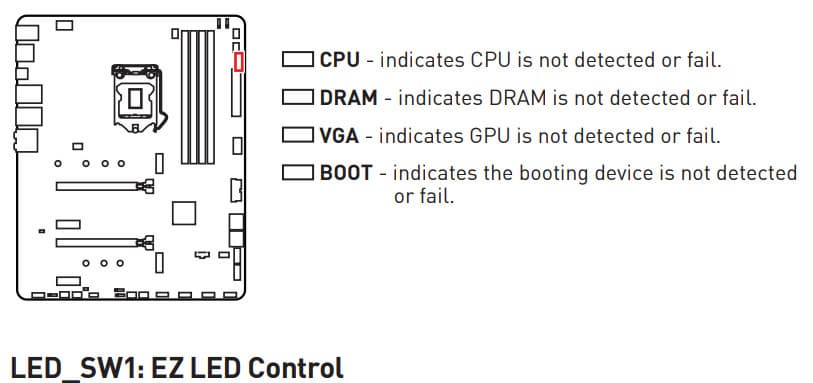 У платы есть световые индикаторы, сообщающие о проблемах с тем или иным компонентом системы.