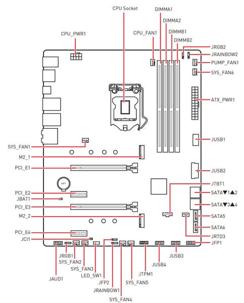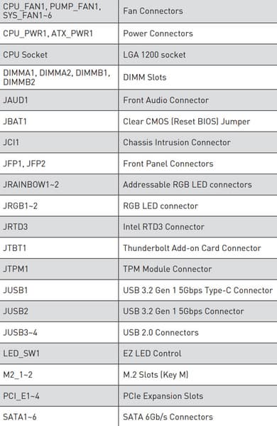 | Прочие внутренние элементы | 24-контактный разъем питания ATX 1 8-контактный разъем питания EPS12V 1 разъем для подключения порта USB 3.2 Gen1 Type-C 1 разъем для подключения 2 портов USB 3.2 Gen1 2 разъема для подключения 4 портов USB 2.0 8 разъемов для подключения 4-контактных вентиляторов и помп ЖСО 2 разъема для подключения неадресуемой RGB-ленты 2 разъема для подключения адресуемой ARGB-ленты 1 разъем аудио для передней панели корпуса 2 разъема для подключения контроллера Intel Thunderbolt3 1 разъем TPM 2 разъема для подключения управления с передней панели корпуса 1 разъем сброса CMOS 1 переключатель световой индикации |
