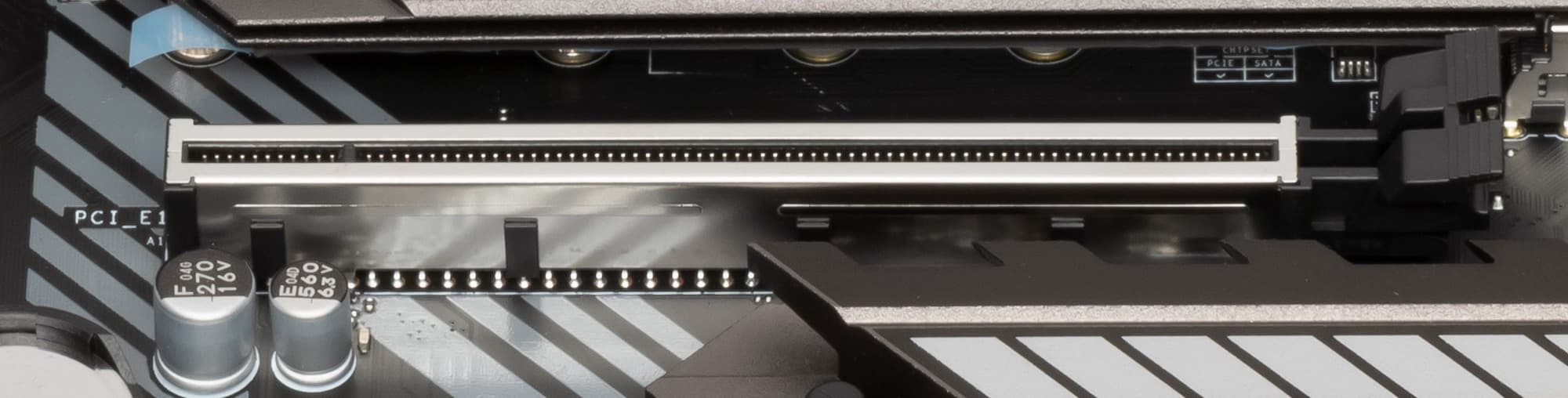 Теперь посмотрим выше на то, как работают процессоры в данной конфигурации. У всех CPU этого плана всего 16 линий PCIe. И в данном случае делить их не требуется: у платы только один слот PCIe x16_1, подключенный к CPU. Вариантов использования PCIe-слотов (включая те, что «питаются» от чипсета) немного: