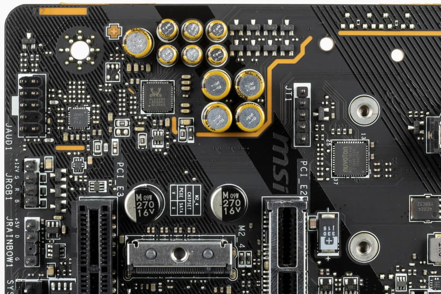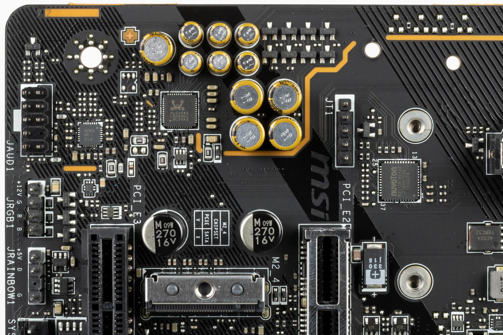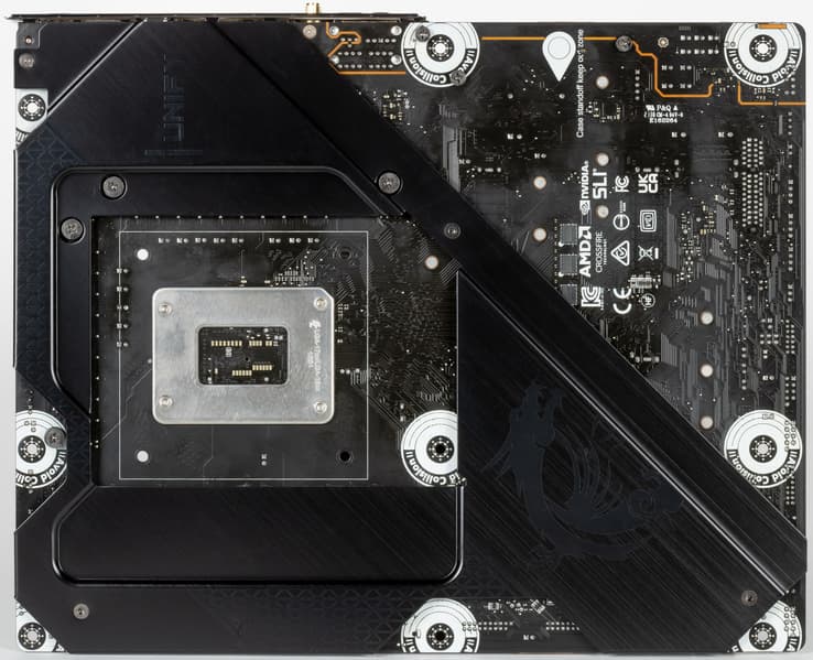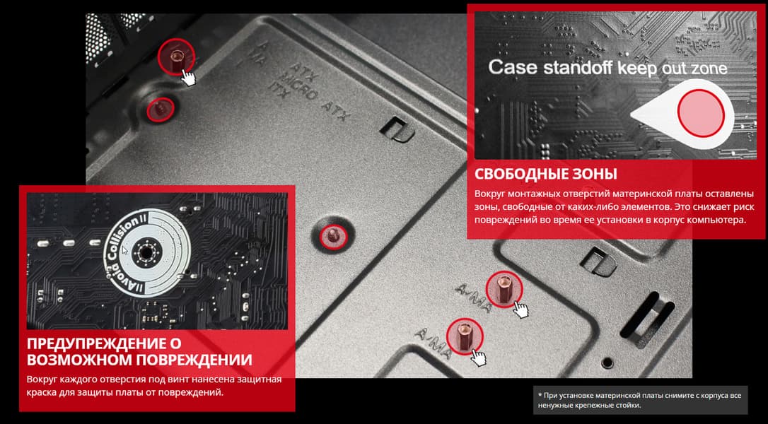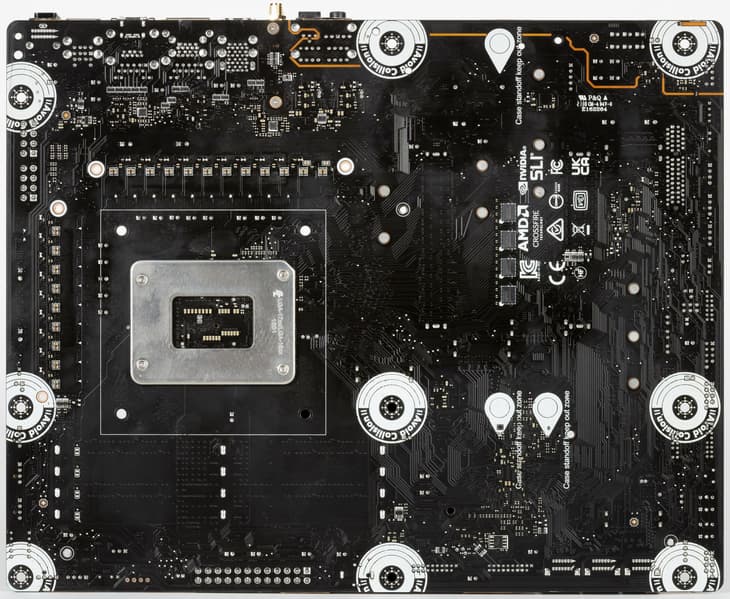 Однако это не все. По традиции у всех плат от MSI на оборотной стороне обозначены места, где могут оставаться ненужные в данный момент крепежные втулки (чаще всего латунные), на которые обычно ложится матплата в корпусе, и к которым ее прикручивают. Эти места отмечены белой краской, и нарочно в них нет никаких электропроводных элементов, чтобы в случае установки матплаты не было случайных замыканий или повреждений от лишней крепежной втулки.