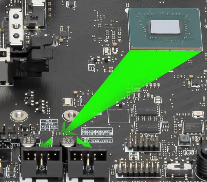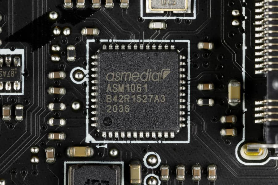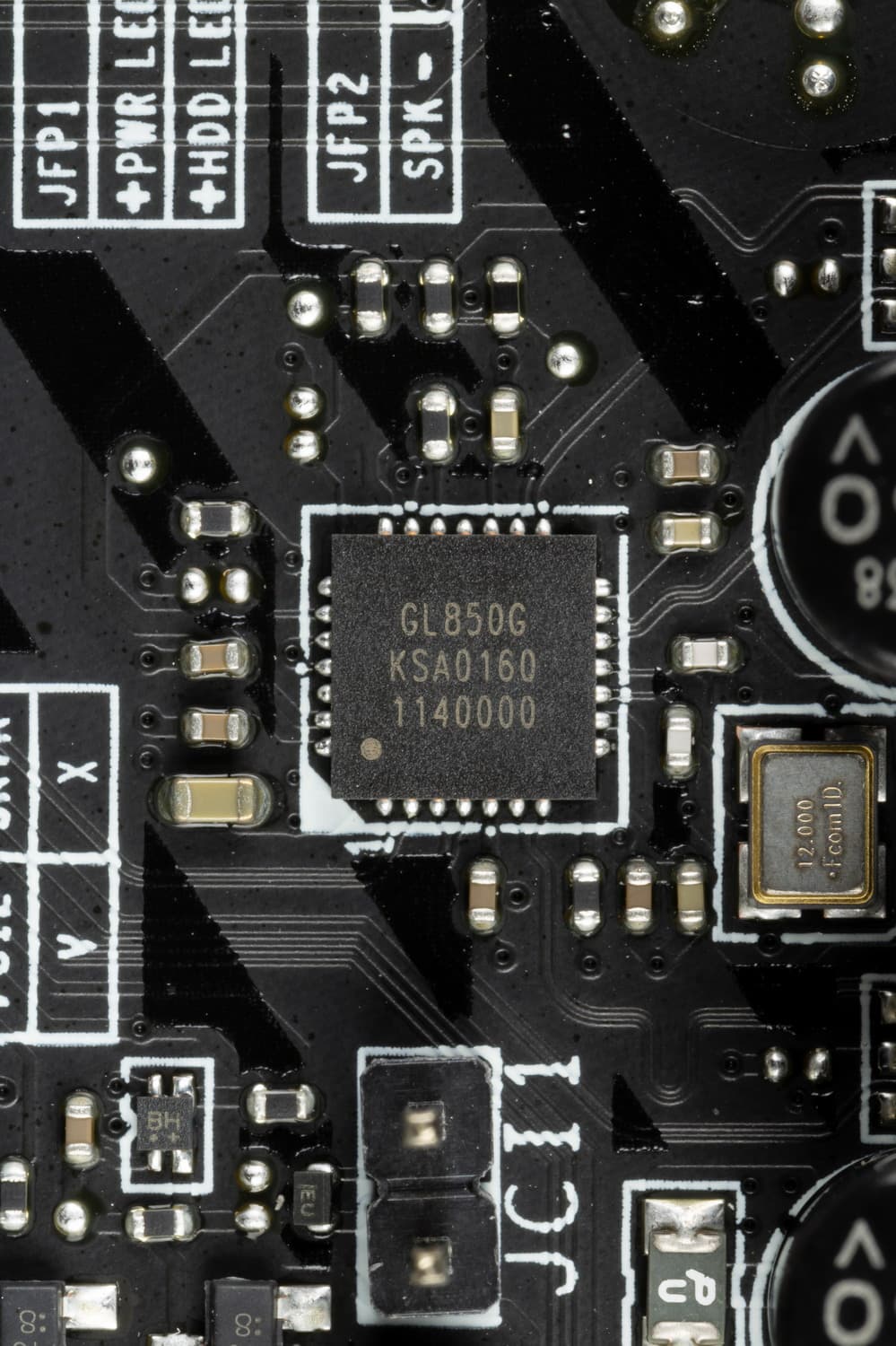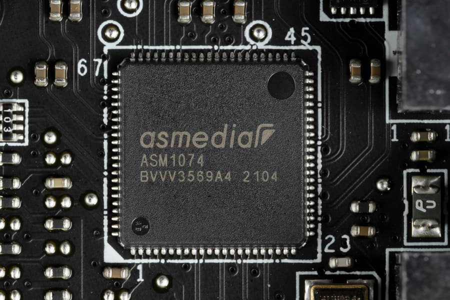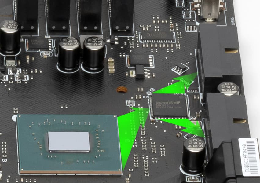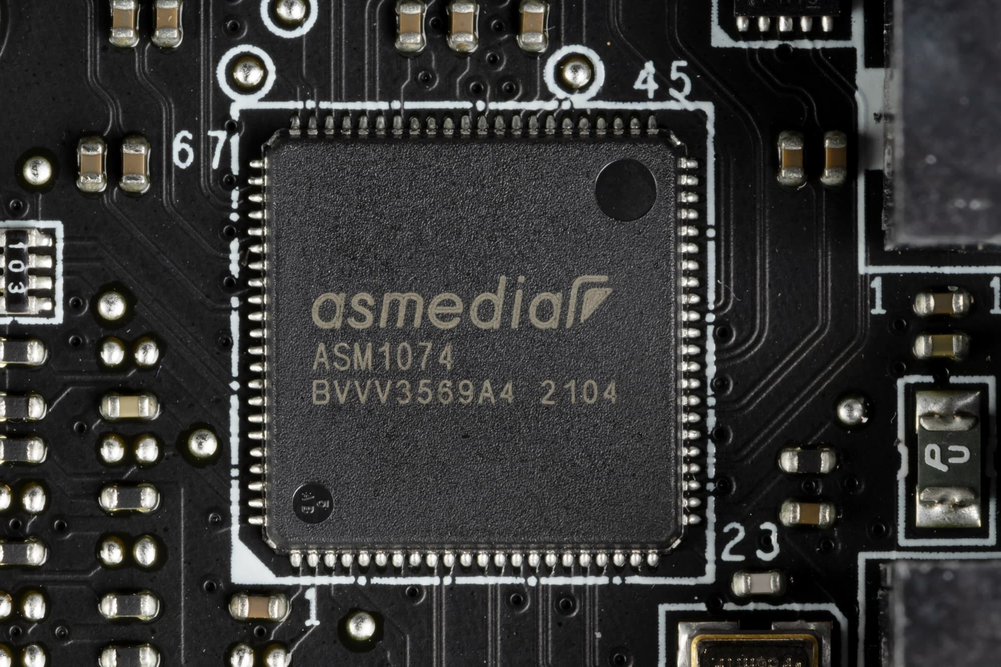 - 4 порта USB 3.2 Gen1: все реализованы через контроллер ASMedia ASM1074 (на него потрачена 1 линия USB 2.0) и представлены двумя внутренними разъемами на материнской плате (каждый на 2 порта);