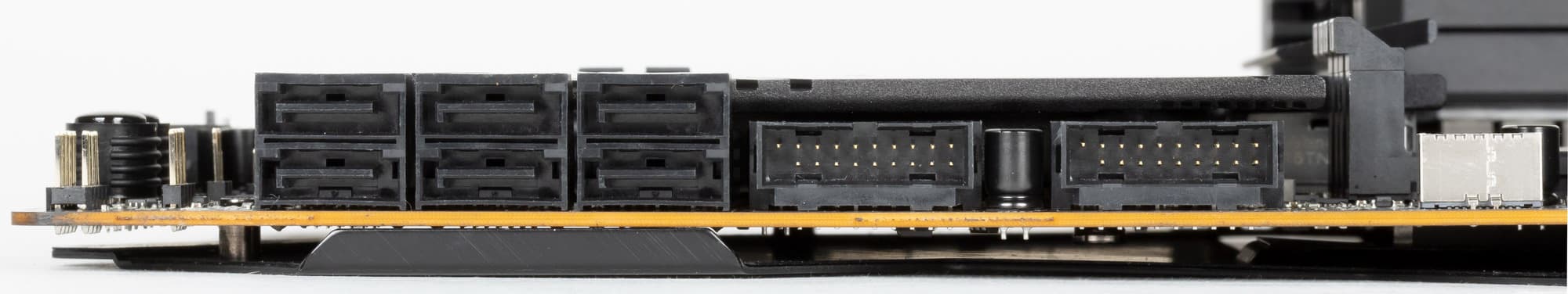 Всего у платы 6 разъемов Serial ATA 6 Гбит/с + 5 (пять!) слотов для накопителей в форм-факторе M.2. Порты SATA промаркированы очень странно, начиная с 5 ( 5, 6, 7, 8), 4 из них реализованы через чипсет Z690 и поддерживают создание RAID.