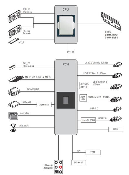 Процессоры Intel Core 12-го поколения (совместимые с сокетом LGA1700 и поддерживаемые Z690) имеют 20 линий ввода-вывода (16 PCIe 5.0, 4 PCIe 4.0), не имеют USB и SATA портов. При этом взаимодействие с Z690 идет по особому каналу Digital Media Interface 4.0 (DMI 4.0 x8). Все PCIe линии процессора идут на слоты расширения PCIe и порт М.2. Serial Peripheral Interface (SPI) используется для взаимодействия с системой UEFI/BIOS, а шина Low Pin Count (LPC) — для связи с устройствами ввода/вывода, не требующими высокой пропускной способности (контроллерами вентиляторов, TPM, старой периферии).