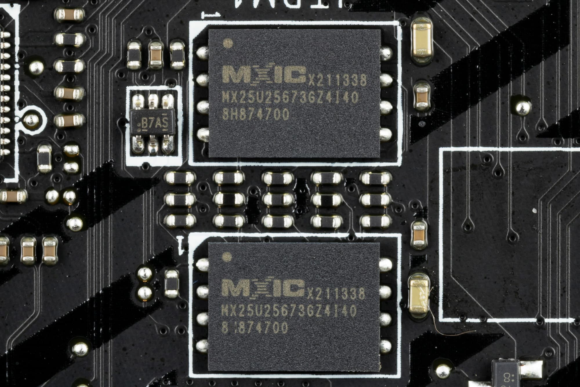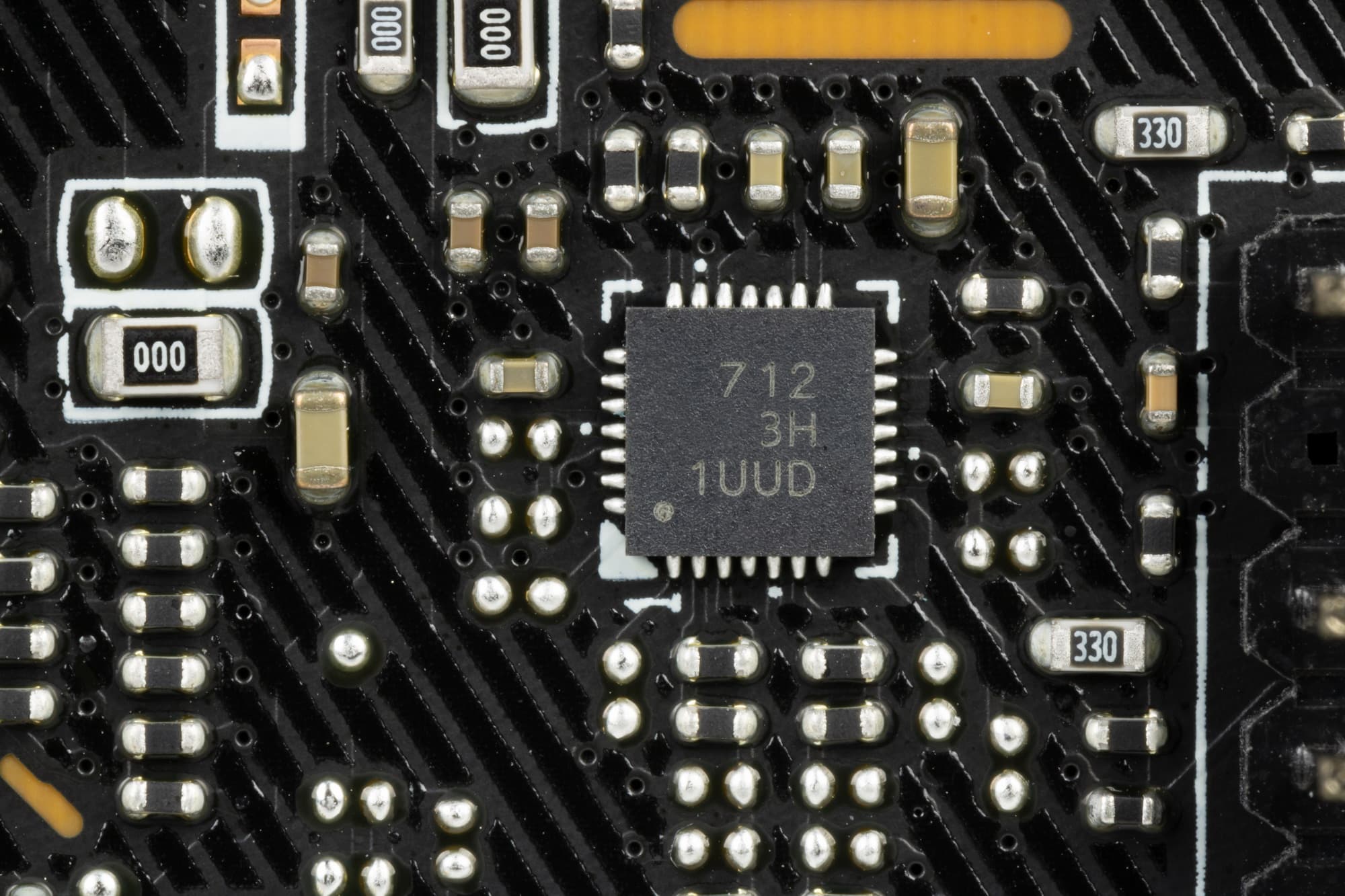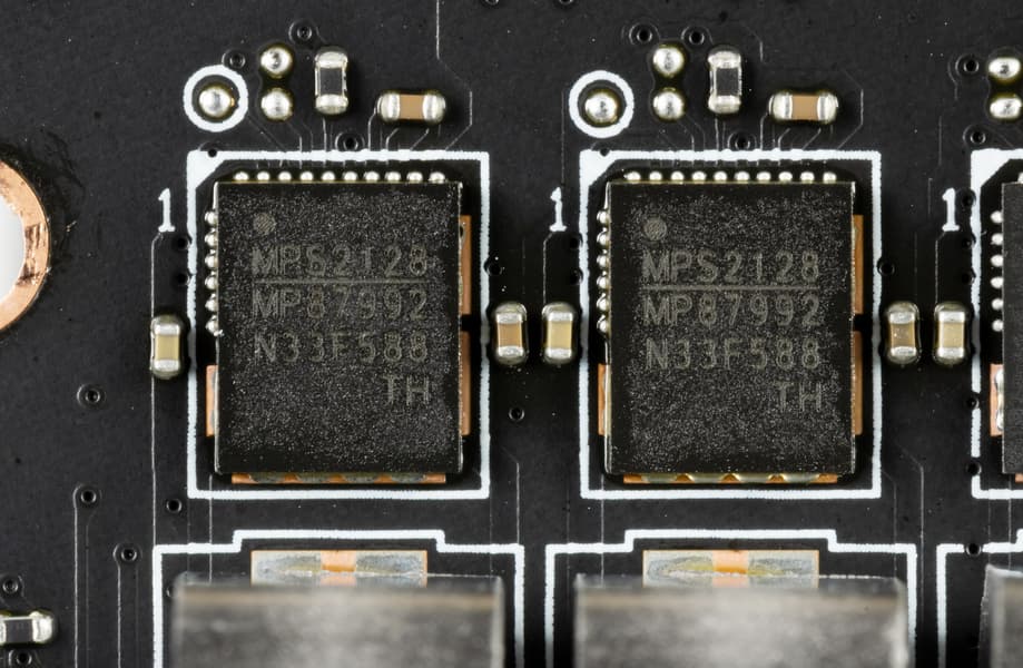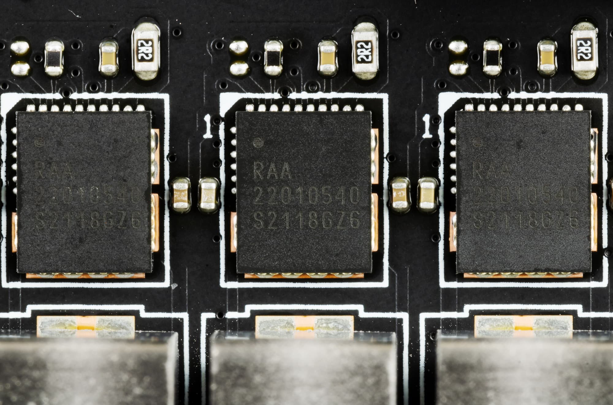 Каждый канал фазы имеет суперферритовый дроссель и RAA 22010540 MOSFET от Renesas на 105 А для VCore и встроенного графического ядра и MP87992 от Monolithic Power Systems для VCCIO на 70А.
