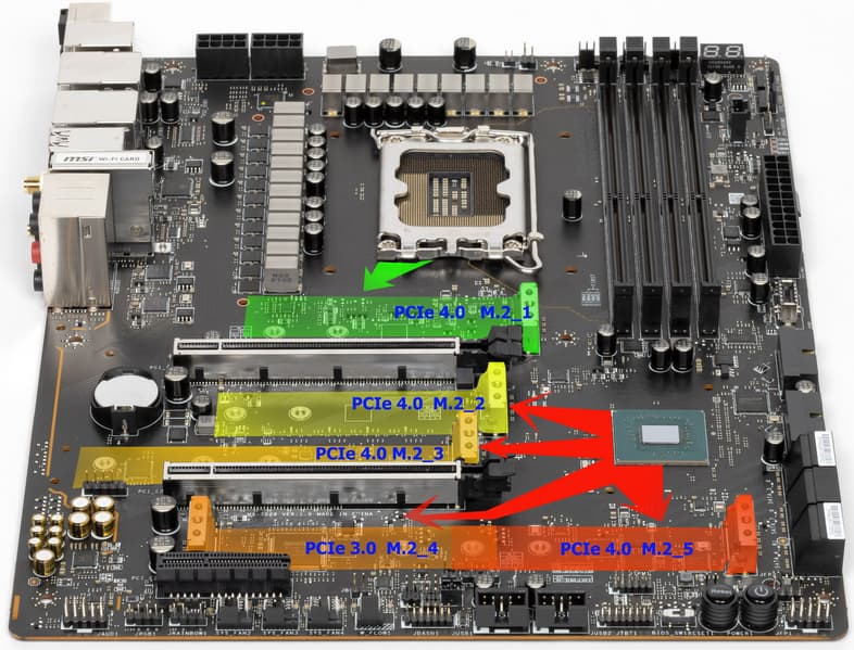 Второй, третий, четвертый и пятый слоты M.2 получают данные от чипсета Z690, при этом М.2_2, 2_3, 2_5 поддерживают PCIe 4.0, а M.2_4 — PCIe 3.0. Первый M.2_1 получает данные от CPU (PCIe 4.0). При этом М.2_3 поддерживает модули с любым интерфейсом, а все остальные работают с модулями только с PCIe интерфейсом.