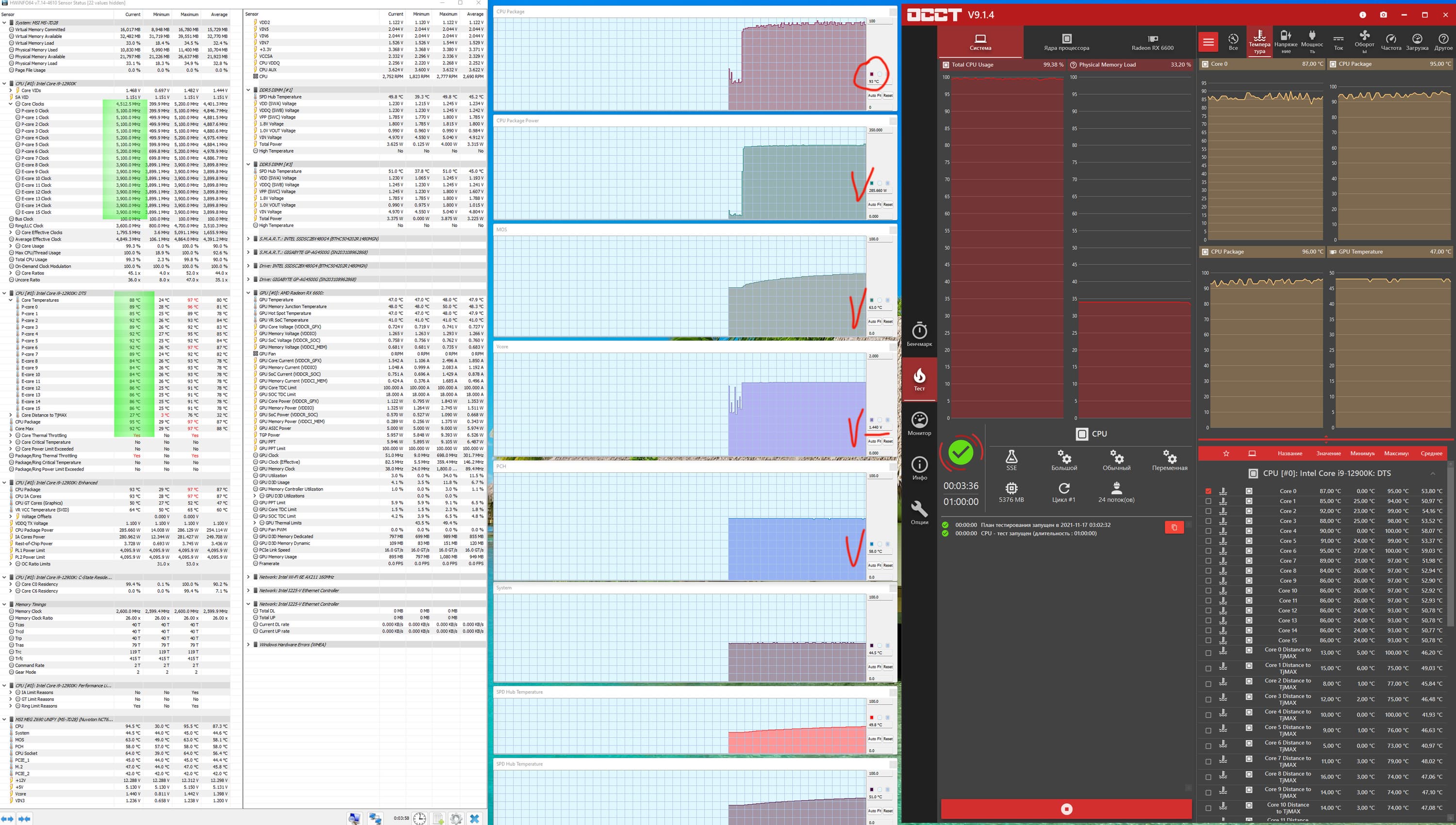 Вот это да! Сходу, по умолчанию нам система выставила 5,1 — 5,2 ГГц по Р-ядрам и 3,9 ГГц по Е-ядрам! Это просто шикарно! То есть вообще по сути ничего не надо разгонять, процессор и так автоматом «выставился» на максимально возможные для него частоты. При этом в стресс-тестах нагрев хоть и подбирался к критическим величинам, но в целом до троттлинга дело не доходило (вернее он был зафиксирован на 1 секунду буквально).