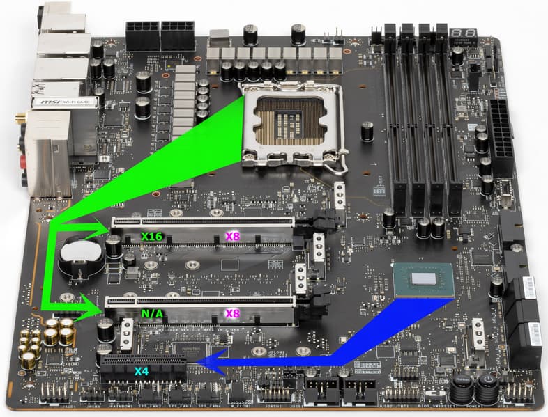 Кроме USB-портов, к которым мы подойдем позже, чипсет Z690 обладает 28 PCIe линиями. Считаем, сколько линий уходит на поддержку (связь) с тем или иным элементом (надо учитывать, что 28 линий не единой версии, а 12 линий PCIe 4.0 и 16 линий PCIe 3.0):