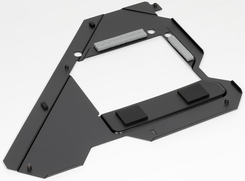 Оборотная сторона — не пустая, там расположен ряд контроллеров и некоторая логика. Текстолит обработан хорошо: во всех точках пайки не только острые концы срезаны, но и все неплохо отшлифовано. С той же стороны установлена пластина из алюминия с наноуглеродным покрытием. Также пластина помогает отводить тепло от задней стороны PCB через термоинтерфейс и обеспечивает жесткость материнской платы.