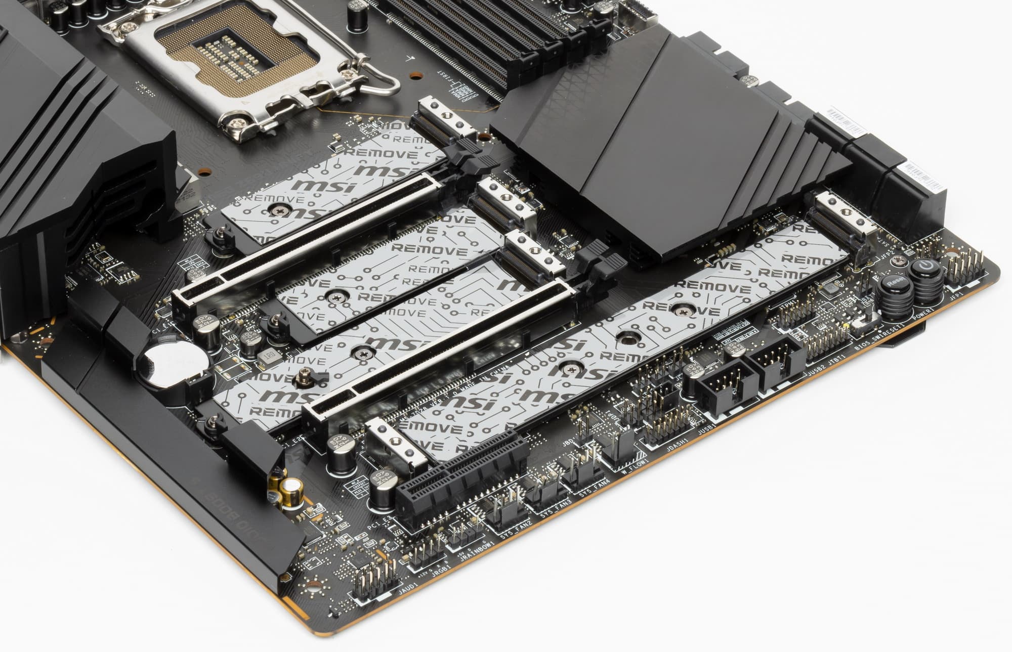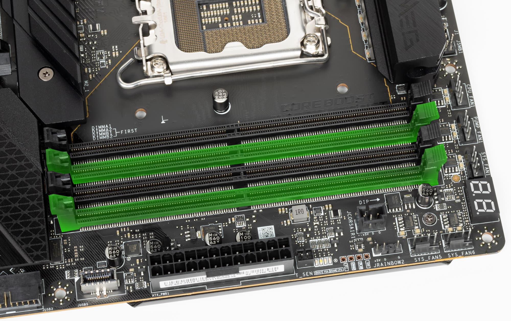 Для установки модулей памяти на плате MSI имеется четыре DIMM-слота (для работы памяти в Dual Channel в случае использования всего 2 модулей их следует устанавливать в А2 и B2 (помечены зеленым цветом). Плата поддерживает небуферизованную память DDR5 (non-EСС), а максимальный объем памяти составляет 128 ГБ. Разумеется, поддерживаются профили XMP.