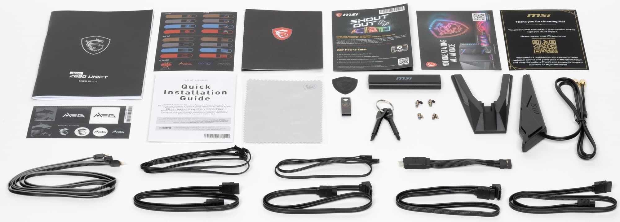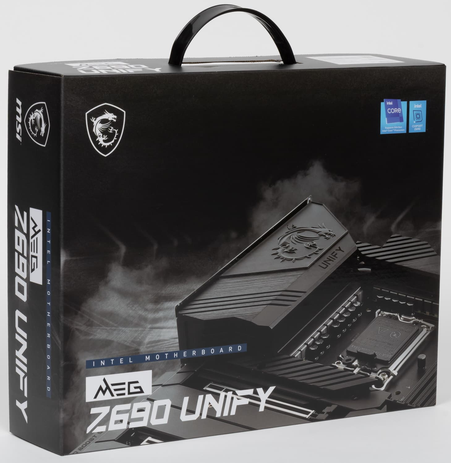 MSI MEG Z690 Unify поставляется в большой коробке фирменного дизайна серии MEG с ручкой (опять же «фишка».серии). Комплект размещен под платой в отдельной коробке.